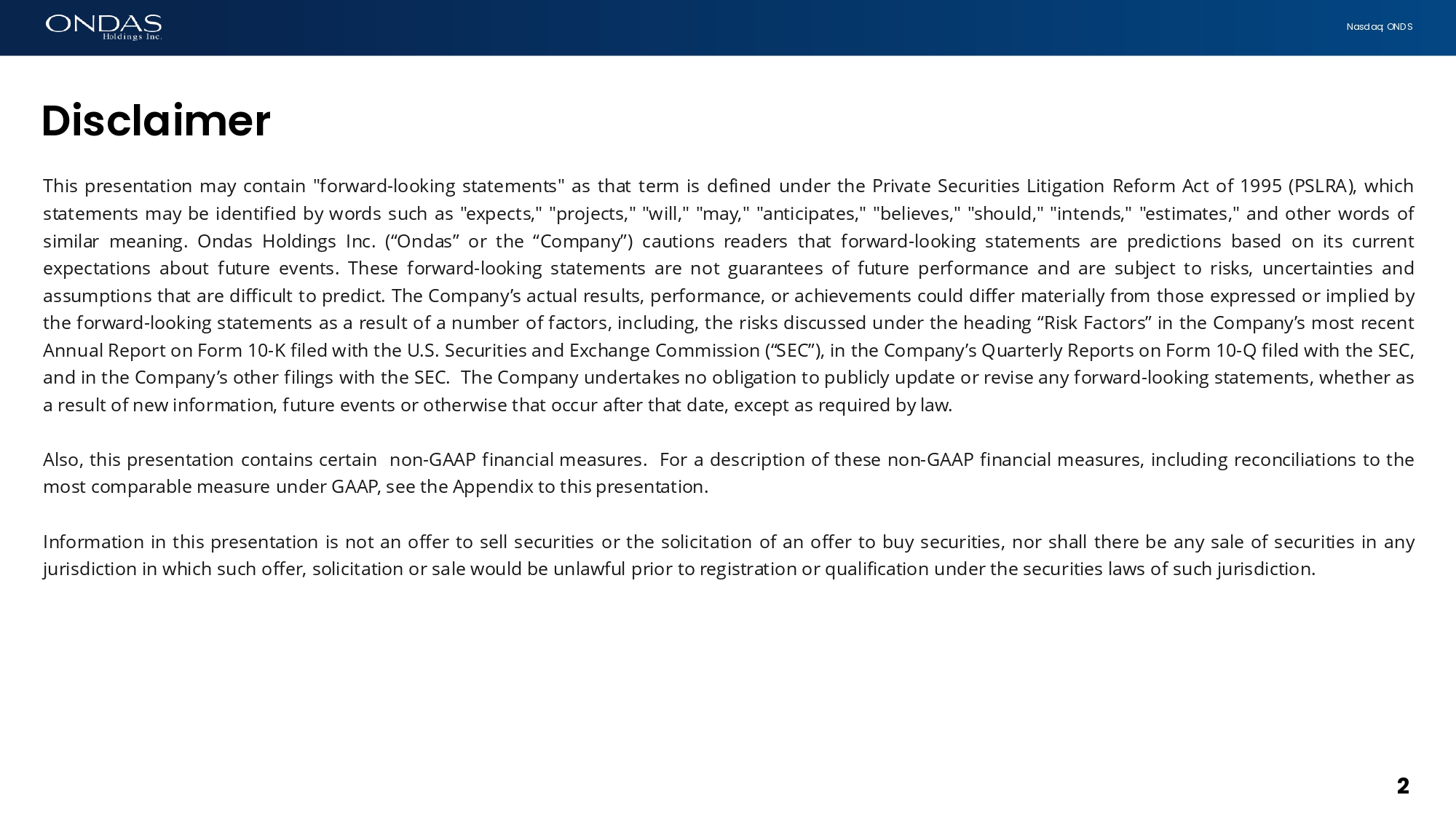 Nasdaq: ONDS This presentation may contain "forward - looking statements" as that term is defined under the Private Securities Litigation Reform Act of 1995 (PSLRA), which statements may be identified by words such as "expects," "projects," "will," "may," "anticipates," "believes," "should," "intends," "estimates," and other words of similar meaning . Ondas Holdings Inc . (“Ondas” or the “Company”) cautions readers that forward - looking statements are predictions based on its current expectations about future events . These forward - looking statements are not guarantees of future performance and are subject to risks, uncertainties and assumptions that are difficult to predict . The Company’s actual results, performance, or achievements could differ materially from those expressed or implied by the forward - looking statements as a result of a number of factors, including, the risks discussed under the heading “Risk Factors” in the Company’s most recent Annual Report on Form 10 - K filed with the U . S . Securities and Exchange Commission (“SEC”), in the Company’s Quarterly Reports on Form 10 - Q filed with the SEC, and in the Company’s other filings with the SEC . The Company undertakes no obligation to publicly update or revise any forward - looking statements, whether as a result of new information, future events or otherwise that occur after that date, except as required by law . Also, this presentation contains certain non - GAAP financial measures . For a description of these non - GAAP financial measures, including reconciliations to the most comparable measure under GAAP, see the Appendix to this presentation . Information in this presentation is not an offer to sell securities or the solicitation of an offer to buy securities, nor shall there be any sale of securities in any jurisdiction in which such offer, solicitation or sale would be unlawful prior to registration or qualification under the securities laws of such jurisdiction . 2 Discl6imer