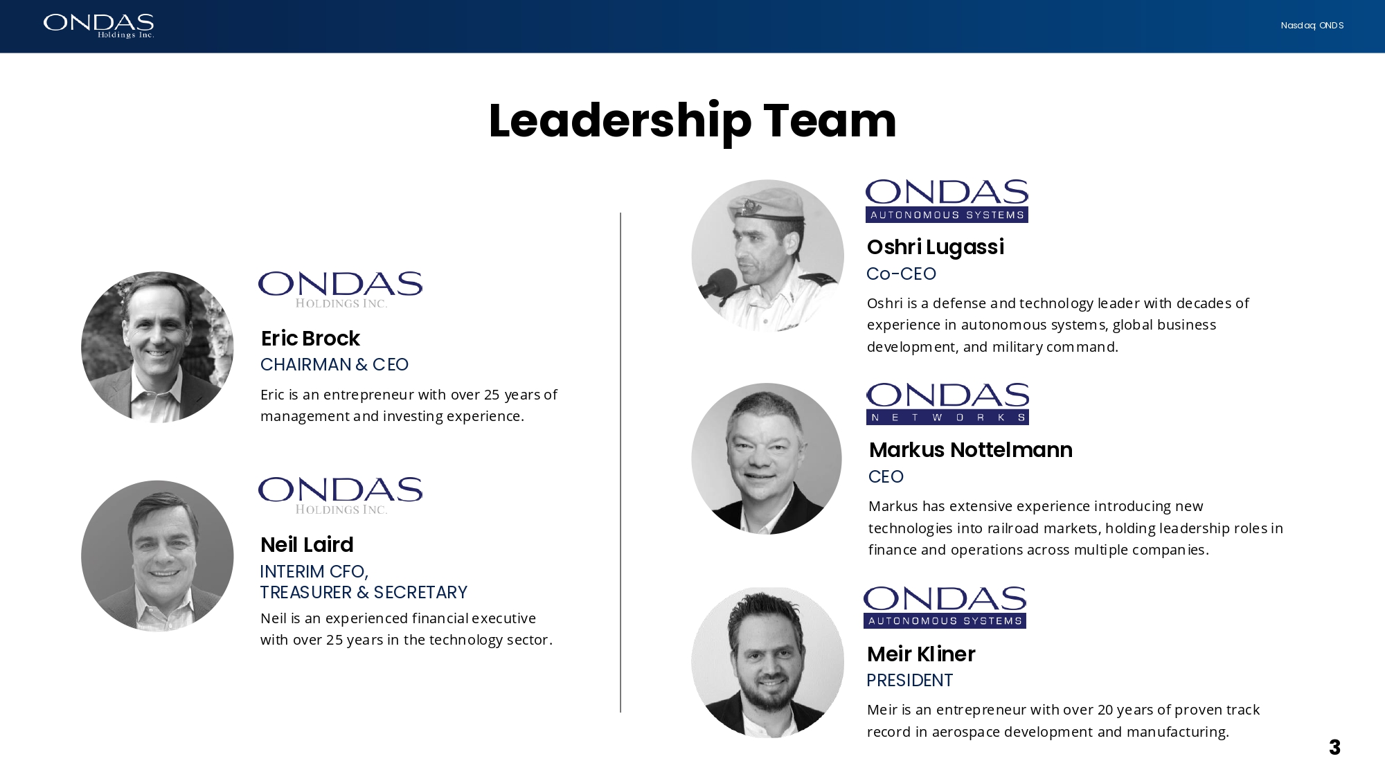 Nasdaq: ONDS Eric Brock CHAIRMAN & CEO Eric is an entrepreneur with over 25 years of management and investing experience. Neil L6ird INTERIM CFO, TREASURER & SECRETARY Neil is an experienced financial executive with over 25 years in the technology sector. Oshri Lug6ssi Co - CEO Oshri is a defense and technology leader with decades of experience in autonomous systems, global business development, and military command. Meir Klifier PRESIDENT Meir is an entrepreneur with over 20 years of proven track record in aerospace development and manufacturing. M6rkus Nottelm6fifi CEO Markus has extensive experience introducing new technologies into railroad markets, holding leadership roles in finance and operations across multiple companies. 3 Leadership Team