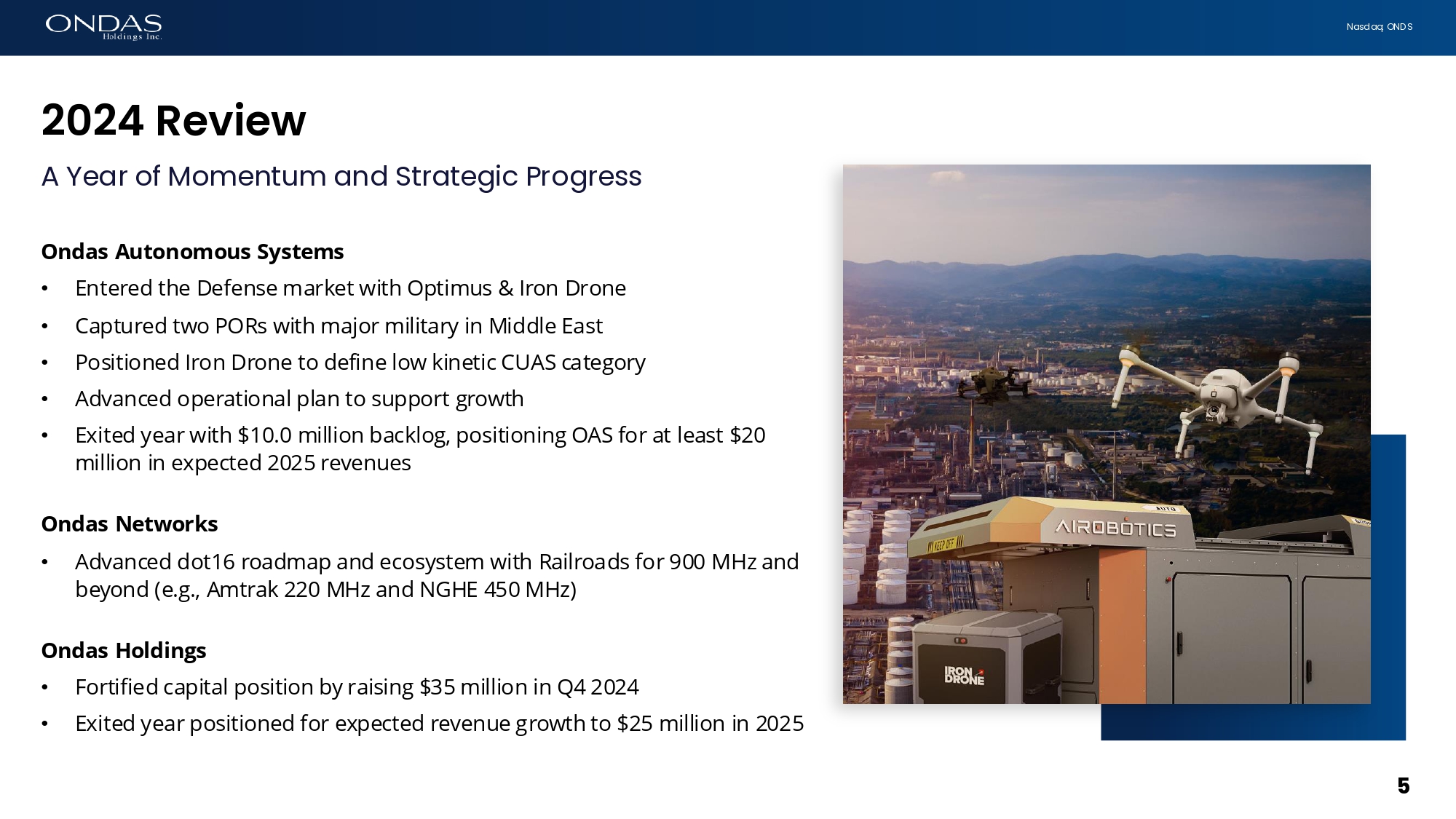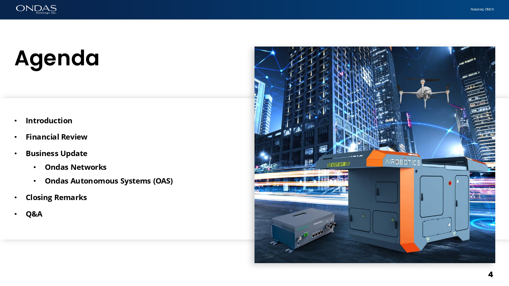 Nasdaq: ONDS Agefid6 4 • Introduction • Financial Review • Business Update • Ondas Networks • Ondas Autonomous Systems (OAS) • Closing Remarks • Q&A