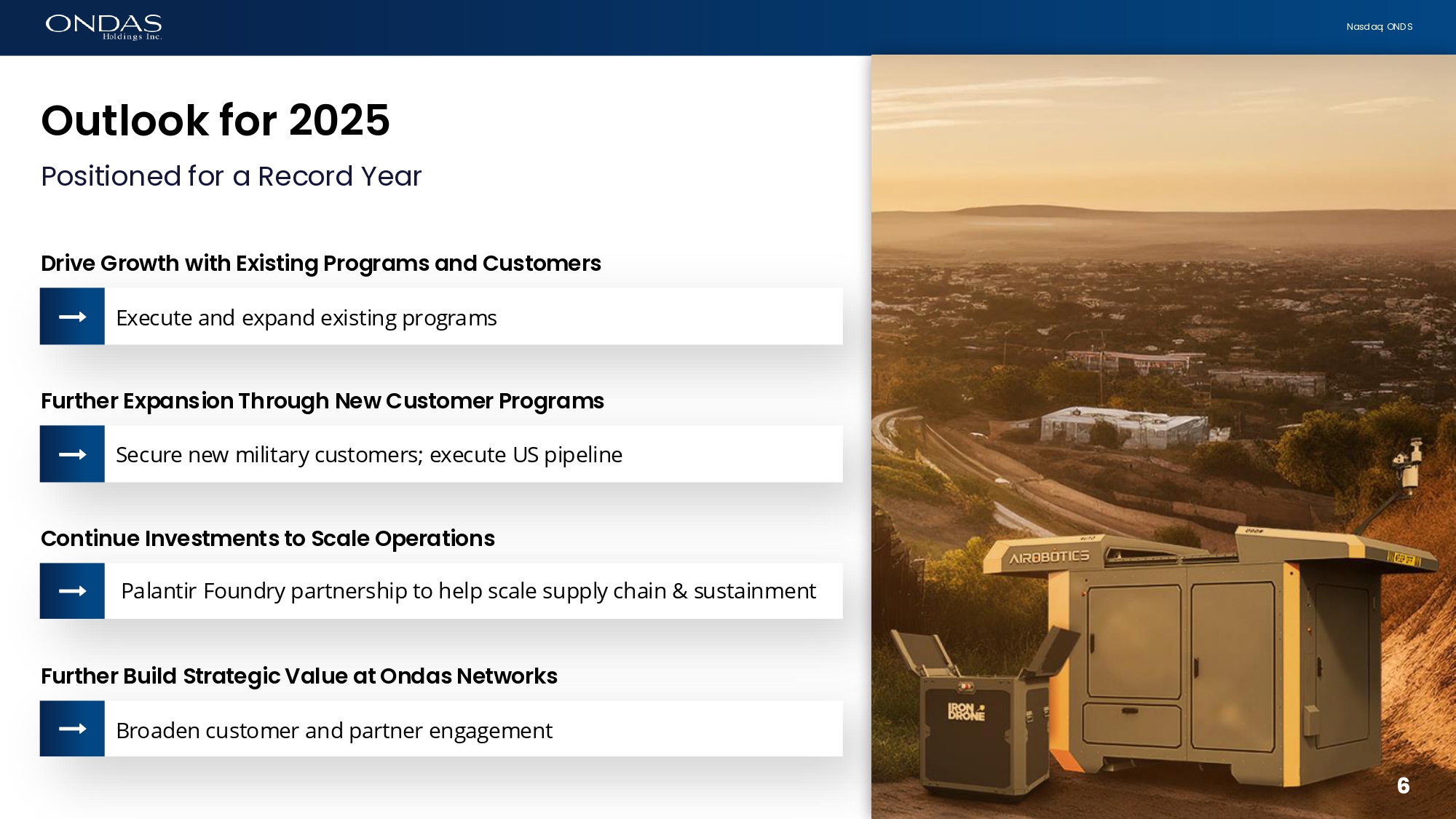 Nasdaq: ONDS 2024 Review 5 A Year of Momentum and Strategic Progress Ondas Autonomous Systems • Entered the Defense market with Optimus & Iron Drone • Captured two PORs with major military in Middle East • Positioned Iron Drone to define low kinetic CUAS category • Advanced operational plan to support growth • Exited year with $10.0 million backlog, positioning OAS for at least $20 million in expected 2025 revenues Ondas Networks • Advanced dot16 roadmap and ecosystem with Railroads for 900 MHz and beyond (e.g., Amtrak 220 MHz and NGHE 450 MHz) Ondas Holdings • Fortified capital position by raising $35 million in Q4 2024 • Exited year positioned for expected revenue growth to $25 million in 2025