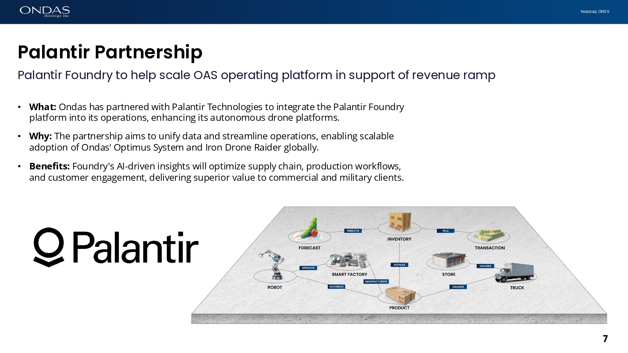 Nasdaq: ONDS P6l6fitir P6rtfiership Palantir Foundry to help scale OAS operating platform in support of revenue ramp • What: Ondas has partnered with Palantir Technologies to integrate the Palantir Foundry platform into its operations, enhancing its autonomous drone platforms. • Why: The partnership aims to unify data and streamline operations, enabling scalable adoption of Ondas' Optimus System and Iron Drone Raider globally. • Benefits: Foundry's AI - driven insights will optimize supply chain, production workflows, and customer engagement, delivering superior value to commercial and military clients. 7