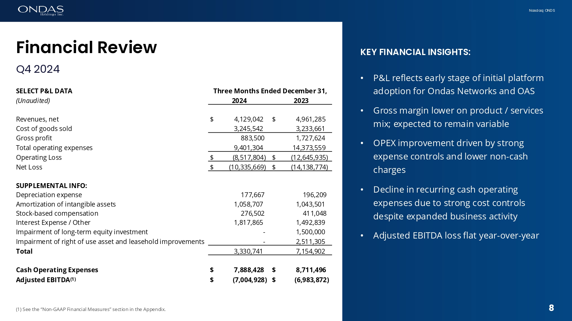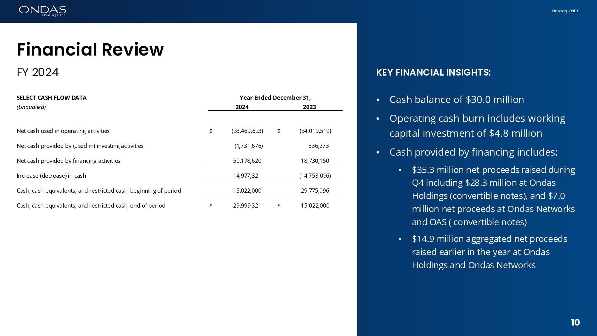 Nasdaq: ONDS KEY FINANCIAL INSIGHTS: 8 9 (1) See the “Non - GAAP Financial Measures” section in the Appendix. • Revenue results due to • War disruptions at OAS • Extended timelines at Ondas Networks • OPEX improvement driven by expense controls and lower non - cash charges • Recurring cash operating expenses reduced due to restructuring benefits in early 2024 and strong cost controls • Adjusted EBITDA loss improved modestly despite levels of revenue and expanded business operations Fifi6fici6l Review FY 2024 Twelve Months Ended December 31, SELECT P&L DATA 2023 2024 (Unaudited) $ 15,691,430 $ 7,192,694 Revenues, net 9,310,256 6,847,511 Cost of goods sold 6,381,174 345,183 Gross profit 46,110,474 34,954,487 Total operating expenses $ (39,729,300) $ (34,609,304) Operating Loss $ (44,844,872) $ (38,007,757) Net Loss SUPPLEMENTAL INFO: 844,833 602,304 Depreciation expense 4,147,092 4,220,436 Amortization of intangible assets 1,047,398 1,265,185 Stock - based compensation 5,115,572 3,398,453 Interest Expense / Other 1,500,000 - Impairment of long - term equity investment 2,511,305 - Impairment of right of use asset and leasehold improvements 15,166,200 9,486,378 Total $ 36,059,846 $ 28,866,562 Cash Operating Expenses $ (29,678,672) $ (28,521,379) Adjusted EBITDA (1)