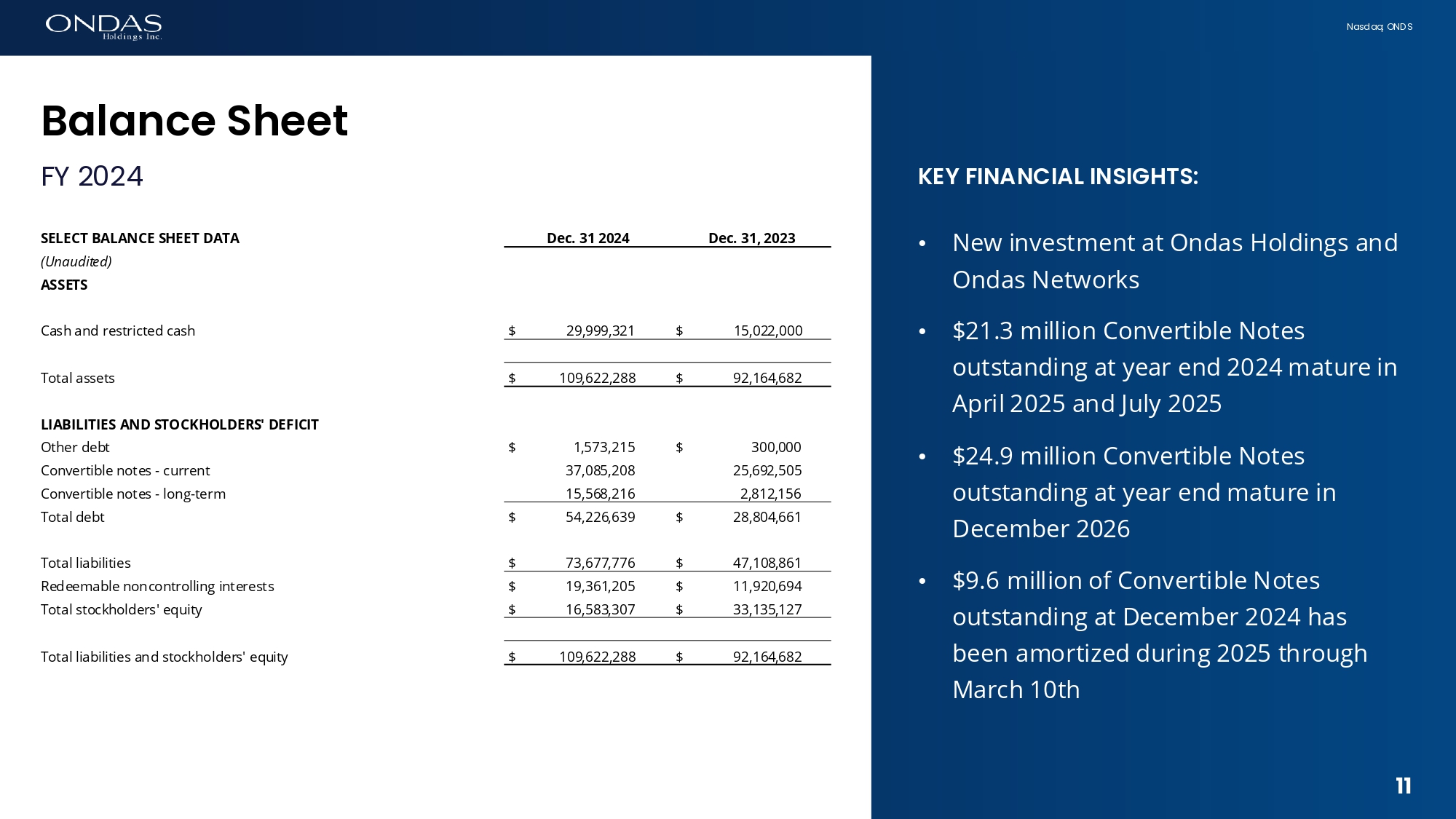 Nasdaq: ONDS KEY FINANCIAL INSIGHTS: 10 10 • Cash balance of $30.0 million • Operating cash burn includes working capital investment of $4.8 million • Cash provided by financing includes: • $35.3 million net proceeds raised during Q4 including $28.3 million at Ondas Holdings (convertible notes), and $7.0 million net proceeds at Ondas Networks and OAS ( convertible notes) • $14.9 million aggregated net proceeds raised earlier in the year at Ondas Holdings and Ondas Networks Fifi6fici6l Review FY 2024 Year Ended December 31, SELECT CASH FLOW DATA 2023 2024 (Unaudited) $ (34,019,519) $ (33,469,623) Net cash used in operating activities 536,273 (1,731,676) Net cash provided by (used in) investing activities 18,730,150 50,178,620 Net cash provided by financing activities (14,753,096) 14,977,321 Increase (decrease) in cash 29,775,096 15,022,000 Cash, cash equivalents, and restricted cash, beginning of period $ 15,022,000 $ 29,999,321 Cash, cash equivalents, and restricted cash, end of period