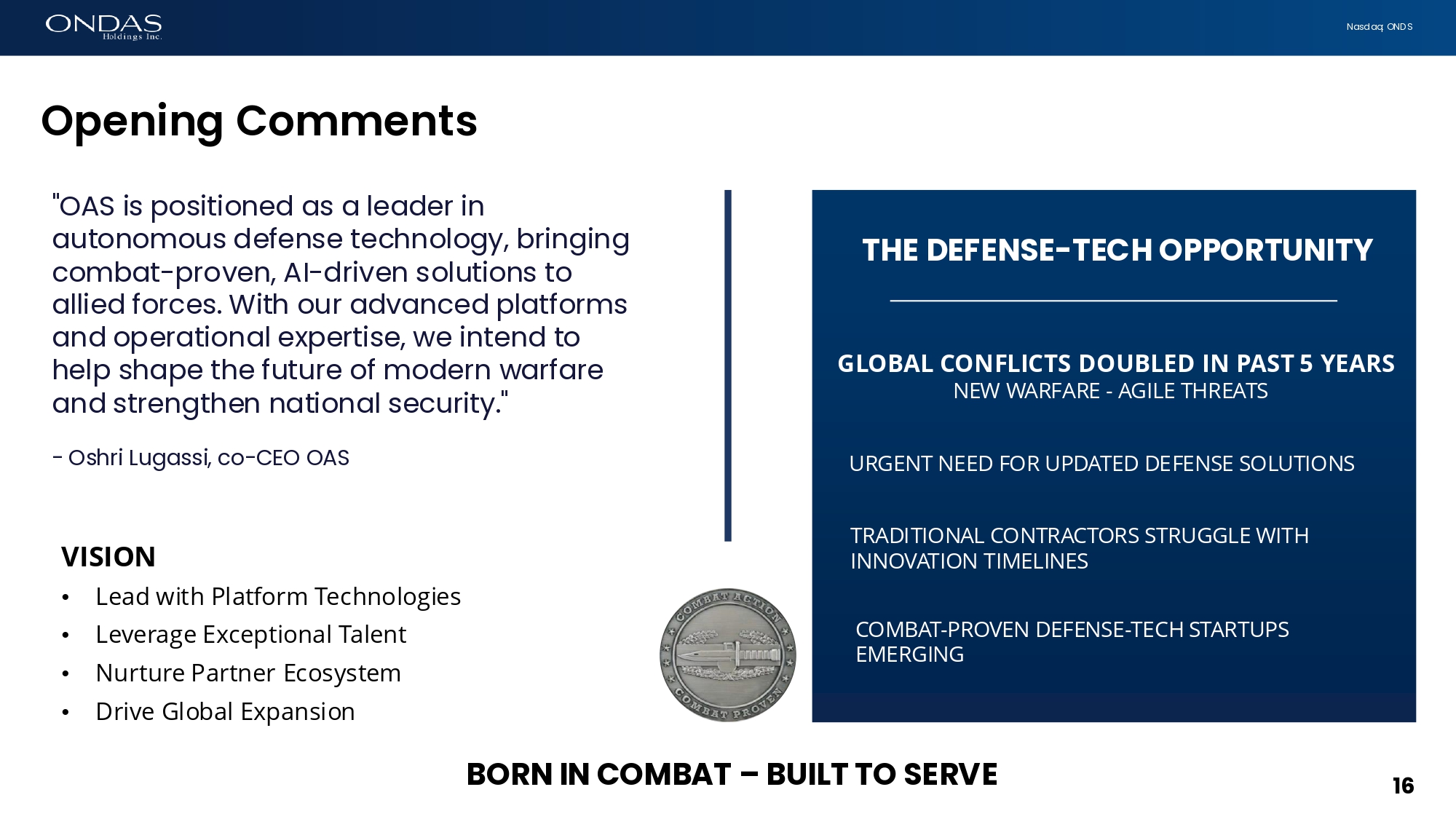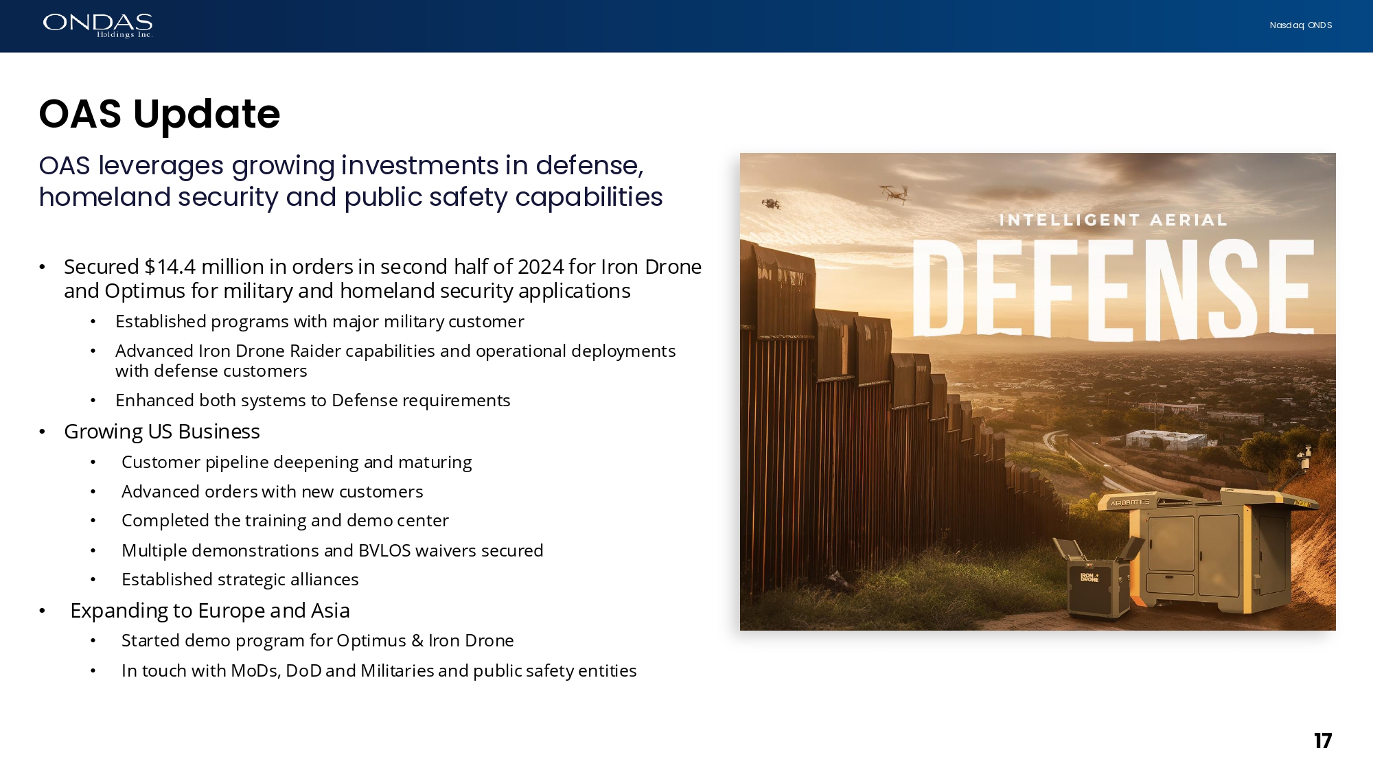 16 Nasdaq: ONDS Opefiifig Commefits "OAS is positioned as a leader in autonomous defense technology, bringing combat - proven, AI - driven solutions to allied forces. With our advanced platforms and operational expertise, we intend to help shape the future of modern warfare and strengthen national security." - Oshri Lugassi, co - CEO OAS THE DEFENSE - TECH OPPORTUNITY GLOBAL CONFLICTS DOUBLED IN PAST 5 YEARS NEW WARFARE - AGILE THREATS TRADITIONAL CONTRACTORS STRUGGLE WITH INNOVATION TIMELINES URGENT NEED FOR UPDATED DEFENSE SOLUTIONS COMBAT - PROVEN DEFENSE - TECH STARTUPS EMERGING VISION • Lead with Platform Technologies • Leverage Exceptional Talent • Nurture Partner Ecosystem • Drive Global Expansion BORN IN COMBAT – BUILT TO SERVE