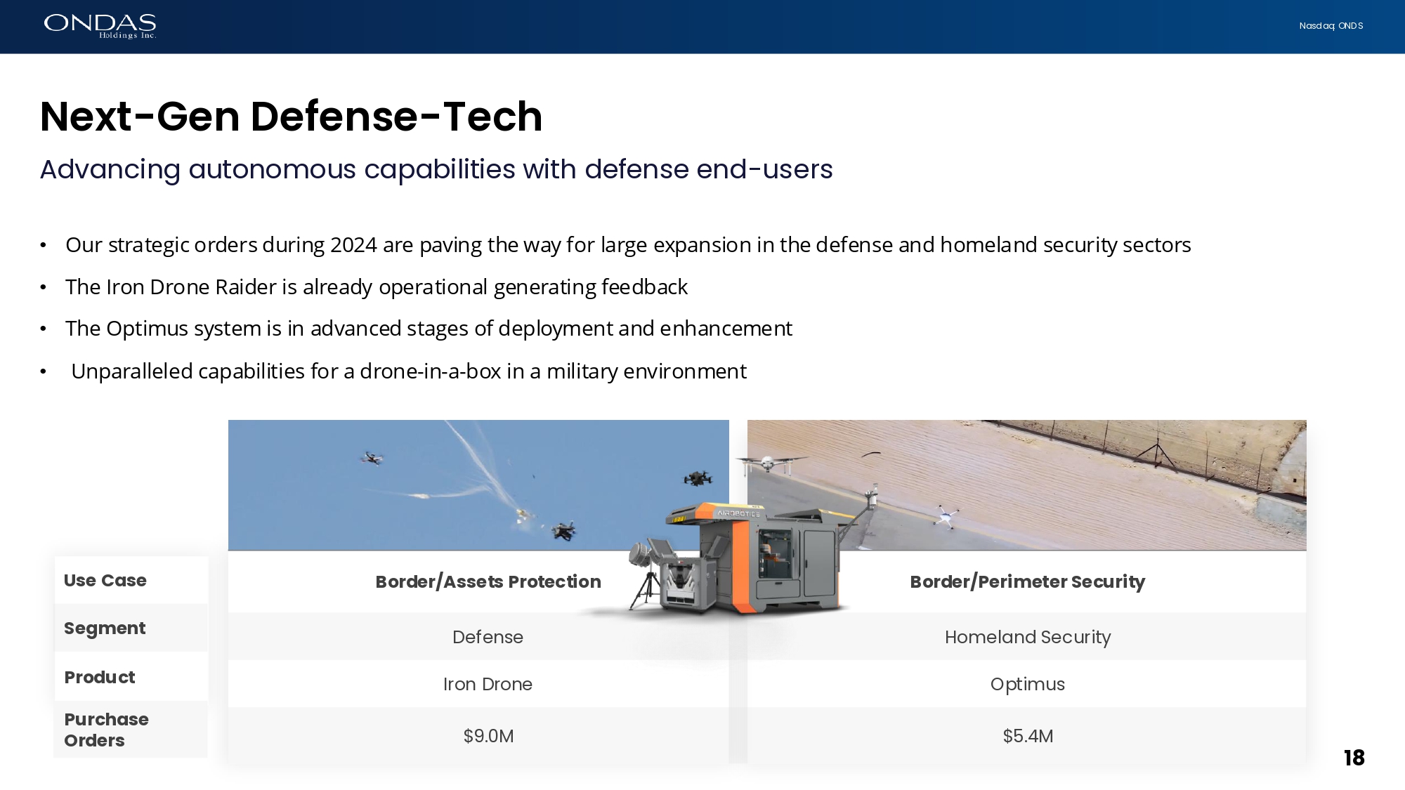 Nasdaq: ONDS OAS Upd6te 17 OAS leverages growing investments in defense, homeland security and public safety capabilities • Secured $14.4 million in orders in second half of 2024 for Iron Drone and Optimus for military and homeland security applications • Established programs with major military customer • Advanced Iron Drone Raider capabilities and operational deployments with defense customers • Enhanced both systems to Defense requirements • Growing US Business • Customer pipeline deepening and maturing • Advanced orders with new customers • Completed the training and demo center • Multiple demonstrations and BVLOS waivers secured • Established strategic alliances • Expanding to Europe and Asia • Started demo program for Optimus & Iron Drone • In touch with MoDs, DoD and Militaries and public safety entities