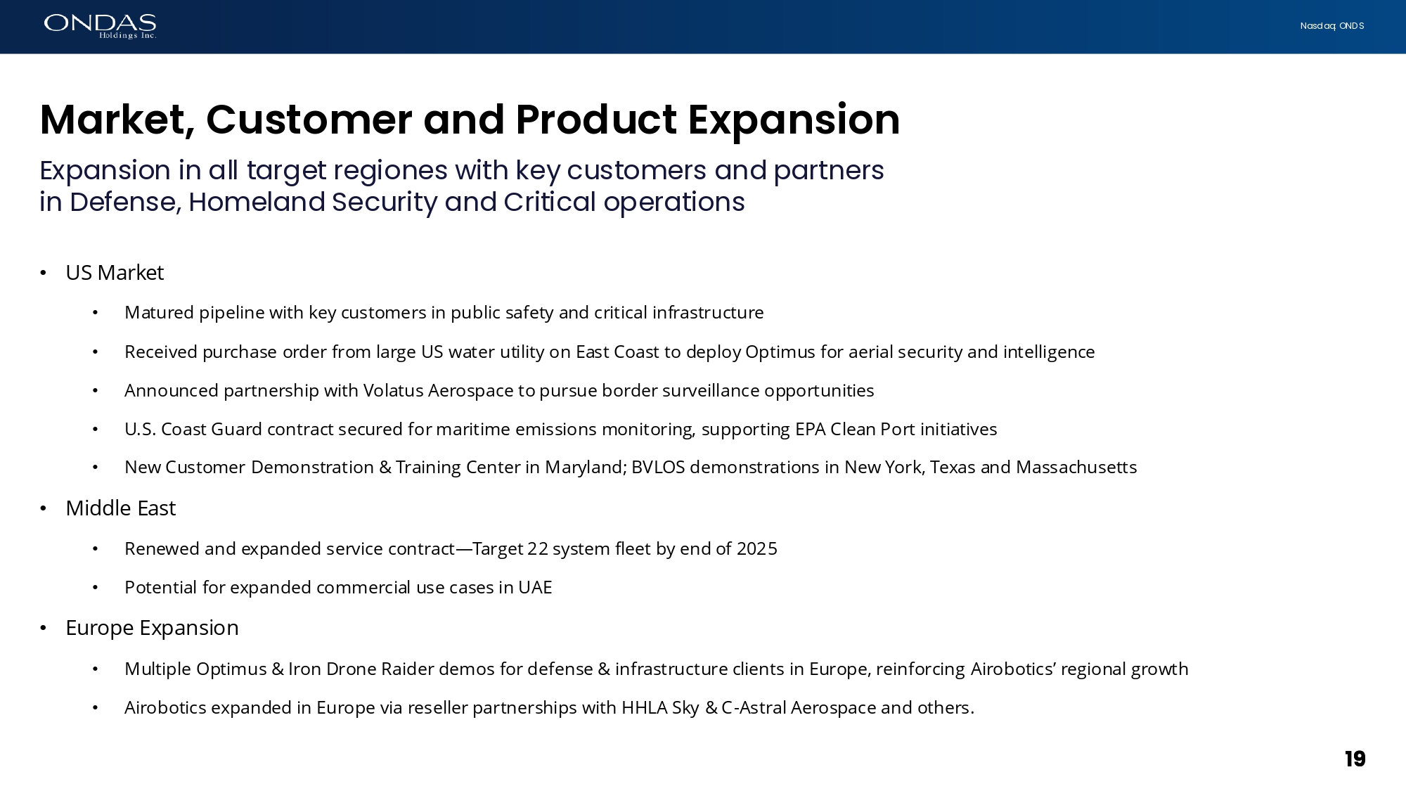 Nasdaq: ONDS Next - Gefi Defefise - Tech Advancing autonomous capabilities with defense end - users • Our strategic orders during 2024 are paving the way for large expansion in the defense and homeland security sectors • The Iron Drone Raider is already operational generating feedback • The Optimus system is in advanced stages of deployment and enhancement • Unparalleled capabilities for a drone - in - a - box in a military environment Use Case Segment Product Purchase Orders Border/Perimeter Security Border/Assets Protection Homeland Security Defense Optimus Iron Drone $5.4M $9.0M 18