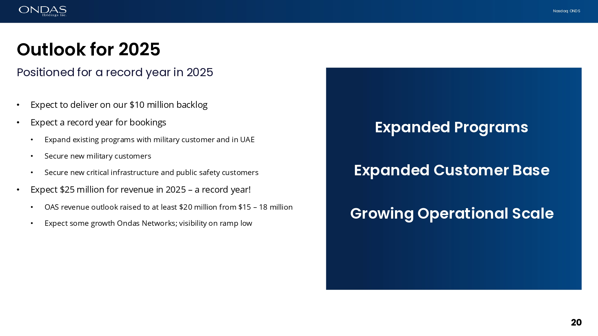 Nasdaq: ONDS M6rket, Customer 6fid Product Exp6fisiofi 19 Expansion in all target regiones with key customers and partners in Defense, Homeland Security and Critical operations • US Market • Matured pipeline with key customers in public safety and critical infrastructure • Received purchase order from large US water utility on East Coast to deploy Optimus for aerial security and intelligence • Announced partnership with Volatus Aerospace to pursue border surveillance opportunities • U.S. Coast Guard contract secured for maritime emissions monitoring, supporting EPA Clean Port initiatives • New Customer Demonstration & Training Center in Maryland; BVLOS demonstrations in New York, Texas and Massachusetts • Middle East • Renewed and expanded service contract — Target 22 system fleet by end of 2025 • Potential for expanded commercial use cases in UAE • Europe Expansion • Multiple Optimus & Iron Drone Raider demos for defense & infrastructure clients in Europe, reinforcing Airobotics’ regional growth • Airobotics expanded in Europe via reseller partnerships with HHLA Sky & C - Astral Aerospace and others.
