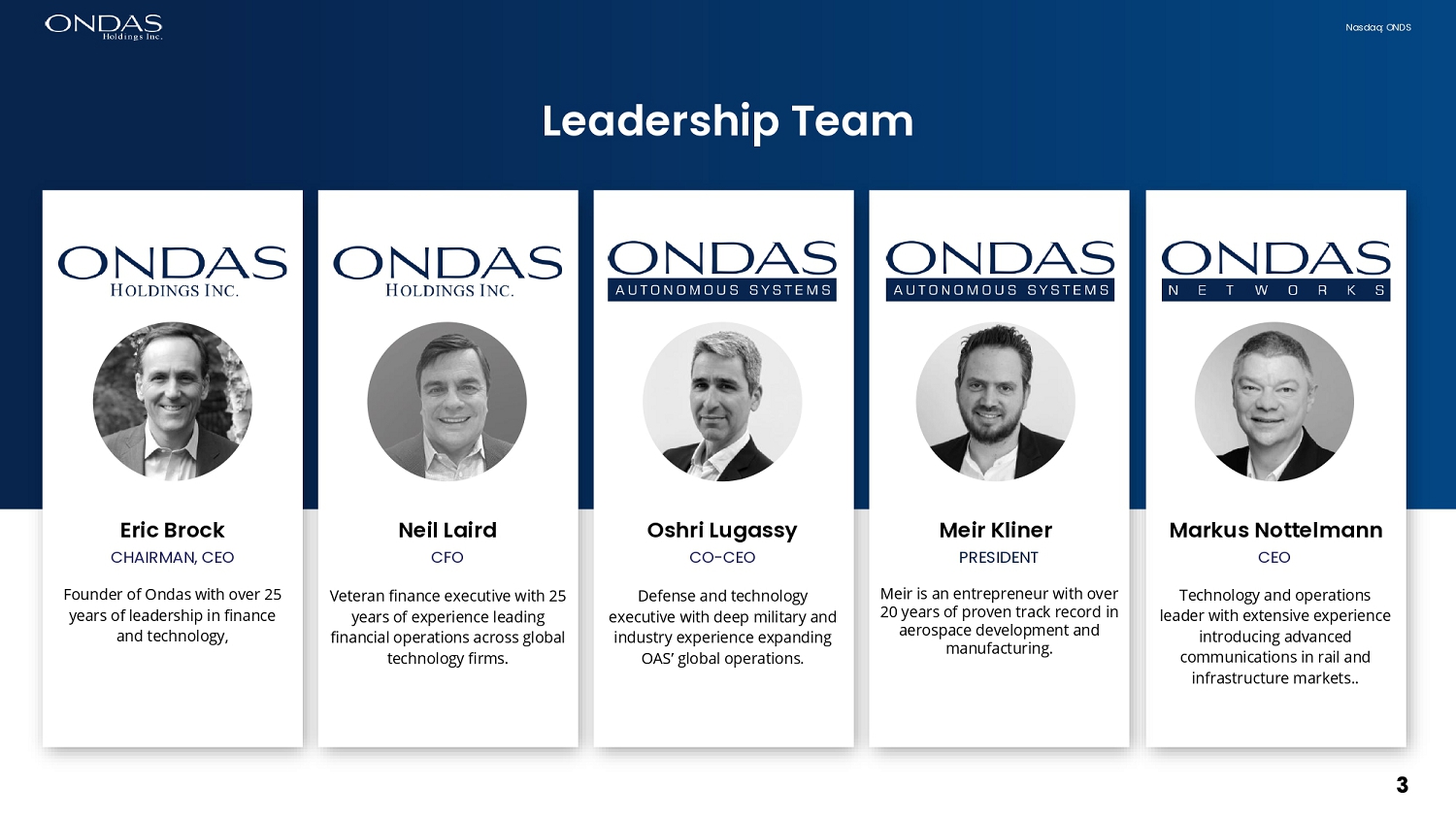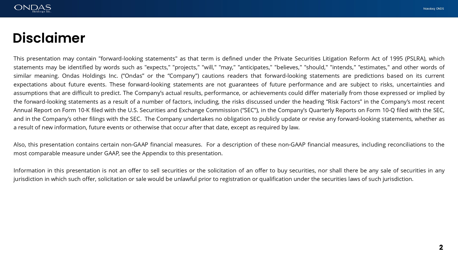 Nasdaq: ONDS This presentation may contain "forward - looking statements" as that term is defined under the Private Securities Litigation Reform Act of 1995 (PSLRA), which statements may be identified by words such as "expects," "projects," "will," "may," "anticipates," "believes," "should," "intends," "estimates," and other words of similar meaning . Ondas Holdings Inc . (“Ondas” or the “Company”) cautions readers that forward - looking statements are predictions based on its current expectations about future events . These forward - looking statements are not guarantees of future performance and are subject to risks, uncertainties and assumptions that are difficult to predict . The Company’s actual results, performance, or achievements could differ materially from those expressed or implied by the forward - looking statements as a result of a number of factors, including, the risks discussed under the heading “Risk Factors” in the Company’s most recent Annual Report on Form 10 - K filed with the U . S . Securities and Exchange Commission (“SEC”), in the Company’s Quarterly Reports on Form 10 - Q filed with the SEC, and in the Company’s other filings with the SEC . The Company undertakes no obligation to publicly update or revise any forward - looking statements, whether as a result of new information, future events or otherwise that occur after that date, except as required by law . Also, this presentation contains certain non - GAAP financial measures . For a description of these non - GAAP financial measures, including reconciliations to the most comparable measure under GAAP, see the Appendix to this presentation . Information in this presentation is not an offer to sell securities or the solicitation of an offer to buy securities, nor shall there be any sale of securities in any jurisdiction in which such offer, solicitation or sale would be unlawful prior to registration or qualification under the securities laws of such jurisdiction . 2 Discl6imer