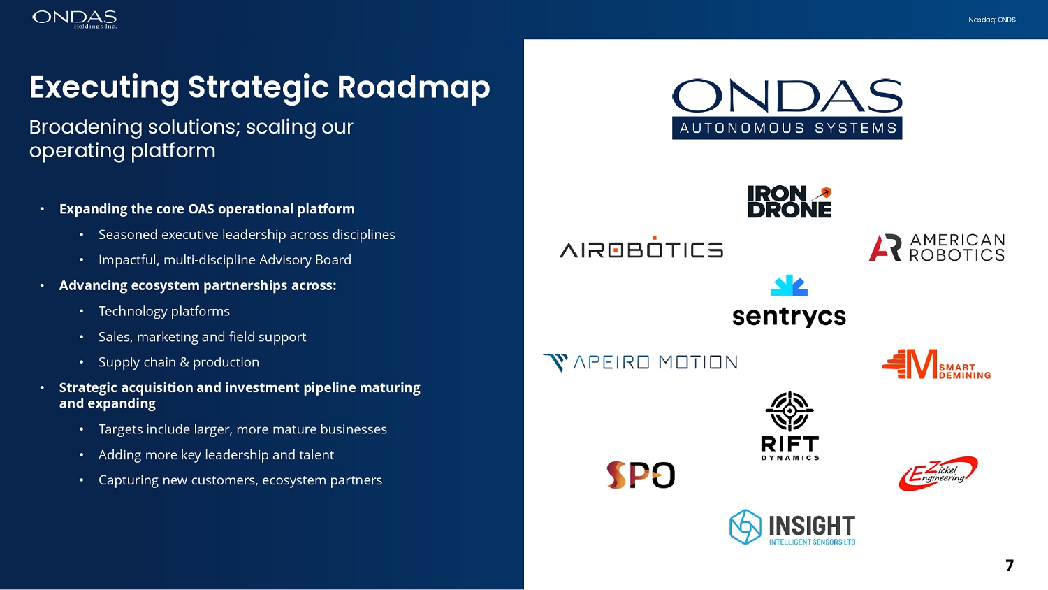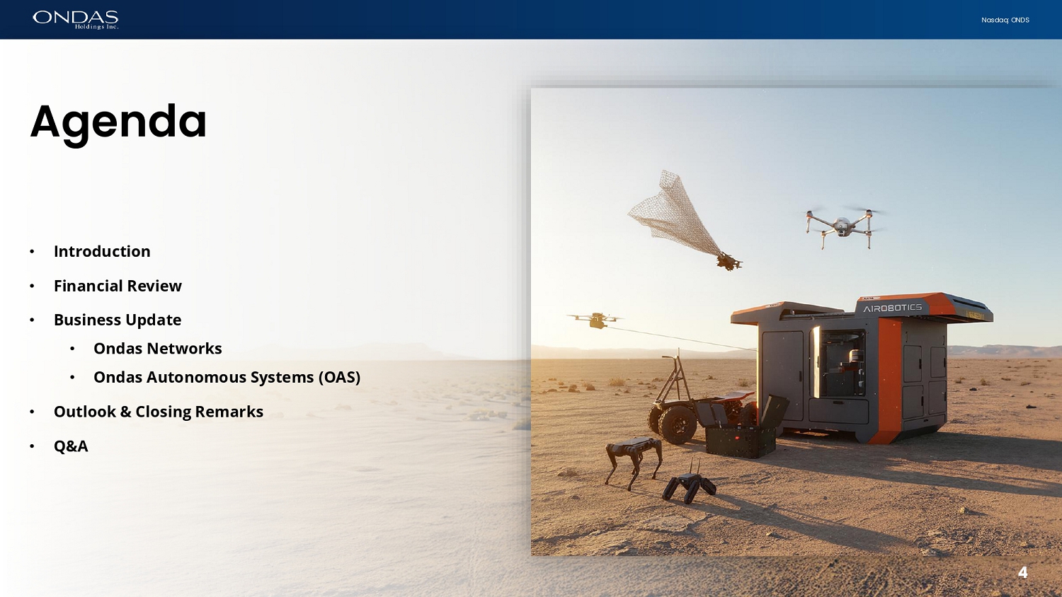 Nasdaq: ONDS Agefid6 • Introduction • Financial Review • Business Update • Ondas Networks • Ondas Autonomous Systems (OAS) • Outlook & Closing Remarks • Q&A 4 4