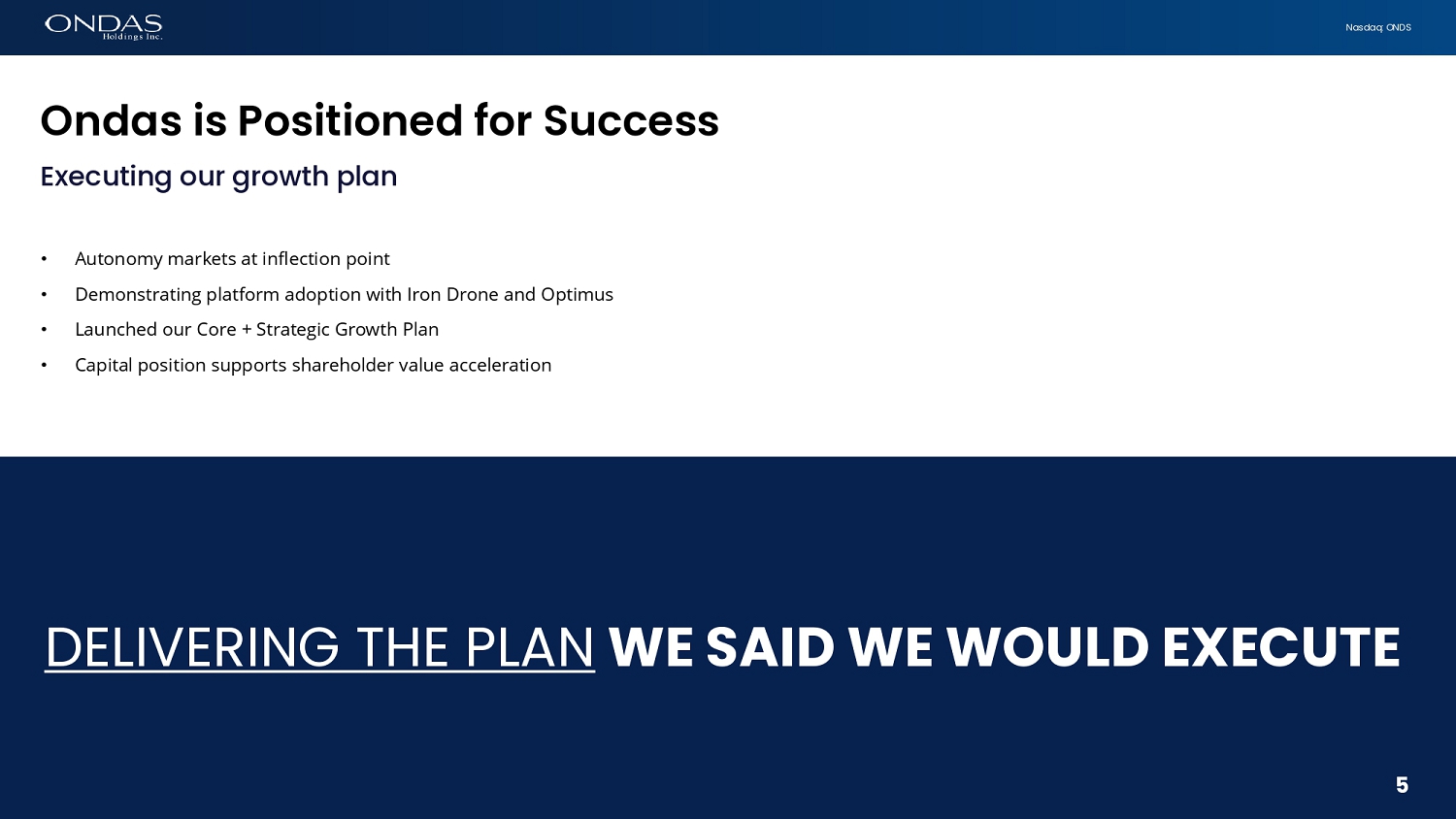 Nasdaq: ONDS Ofid6s is Positiofied for Success 4 5 Executing our growth plan • Autonomy markets at inflection point • Demonstrating platform adoption with Iron Drone and Optimus • Launched our Core + Strategic Growth Plan • Capital position supports shareholder value acceleration DELIVERING THE PLAN WE SAID WE WOULD EXECUTE