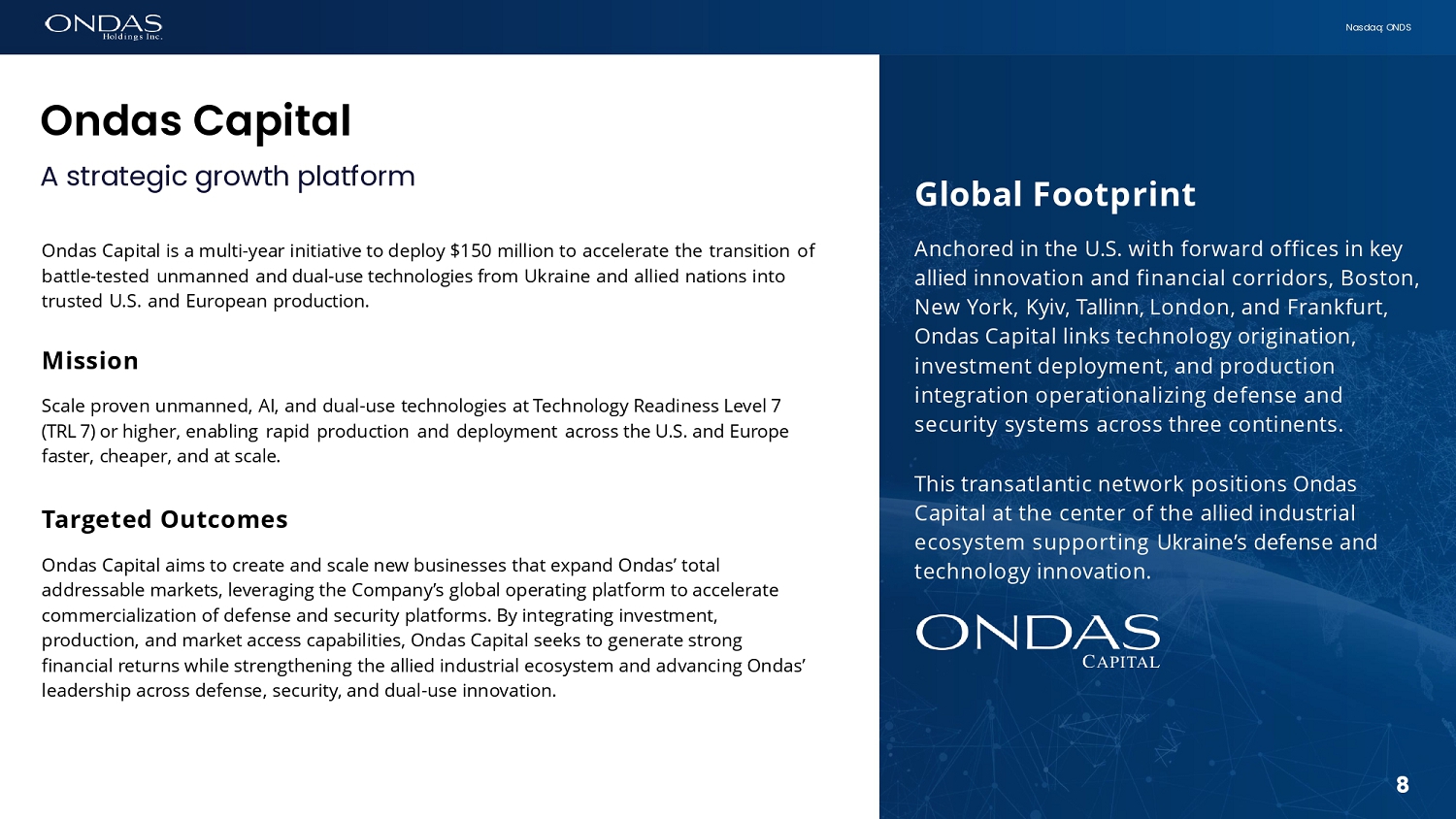 Nasdaq: ONDS Ofid6s C6pit6l A strategic growth platform Ondas Capital is a multi - year initiative to deploy $150 million to accelerate the transition of battle - tested unmanned and dual - use technologies from Ukraine and allied nations into trusted U.S. and European production. Mission Scale proven unmanned, AI, and dual - use technologies at Technology Readiness Level 7 (TRL 7) or higher, enabling rapid production and deployment across the U.S. and Europe faster, cheaper, and at scale. Targeted Outcomes Ondas Capital aims to create and scale new businesses that expand Ondas’ total addressable markets, leveraging the Company’s global operating platform to accelerate commercialization of defense and security platforms. By integrating investment, production, and market access capabilities, Ondas Capital seeks to generate strong financial returns while strengthening the allied industrial ecosystem and advancing Ondas’ leadership across defense, security, and dual - use innovation. Global Footprint Anchored in the U.S. with forward offices in key allied innovation and financial corridors, Boston, New York, Kyiv, Tallinn, London, and Frankfurt, Ondas Capital links technology origination, investment deployment, and production integration operationalizing defense and security systems across three continents. This transatlantic network positions Ondas Capital at the center of the allied industrial ecosystem supporting Ukraine’s defense and technology innovation. 7 8