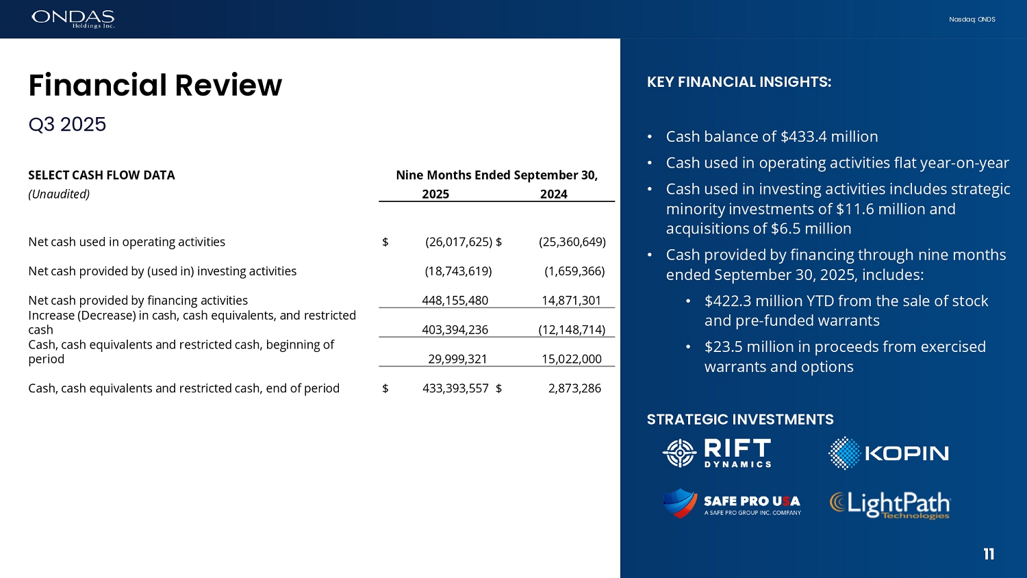 10 Nasdaq: ONDS KEY FINANCIAL INSIGHTS: • Revenue growth reflects strong demand for autonomous, unmanned platforms • Gross profit remains variable due to low volumes and product mix shifts • Increase in cash operating expenses to support scaling OAS operations in advance of expected growth and for strategic program • Adjusted EBITDA loss widened by $1.7 million, largely due to increase in cash operating expenses; partially offset by increase in gross profit (1) See the “Non - GAAP Financial Measures” section in the Appendix. Fifi6fici6l Review Q3 2025 10 Three Months Ended September 30, SELECT P&L DATA 2024 2025 (Unaudited) $ 1,480,792 $ 10,098,310 Revenues, net 1,433,232 7,493,915 Cost of goods sold 47,560 2,604,395 Gross profit 8,708,275 18,107,945 Total operating expenses $ (8,660,715) $ (15,503,550) Operating Loss $ (9,526,268) $ (7,480,856) Net Loss $ 7,169,381 $ 11,603,280 Cash Operating Expenses (1) $ (7,103,109) $ (8,761,329) Adjusted EBITDA (1)