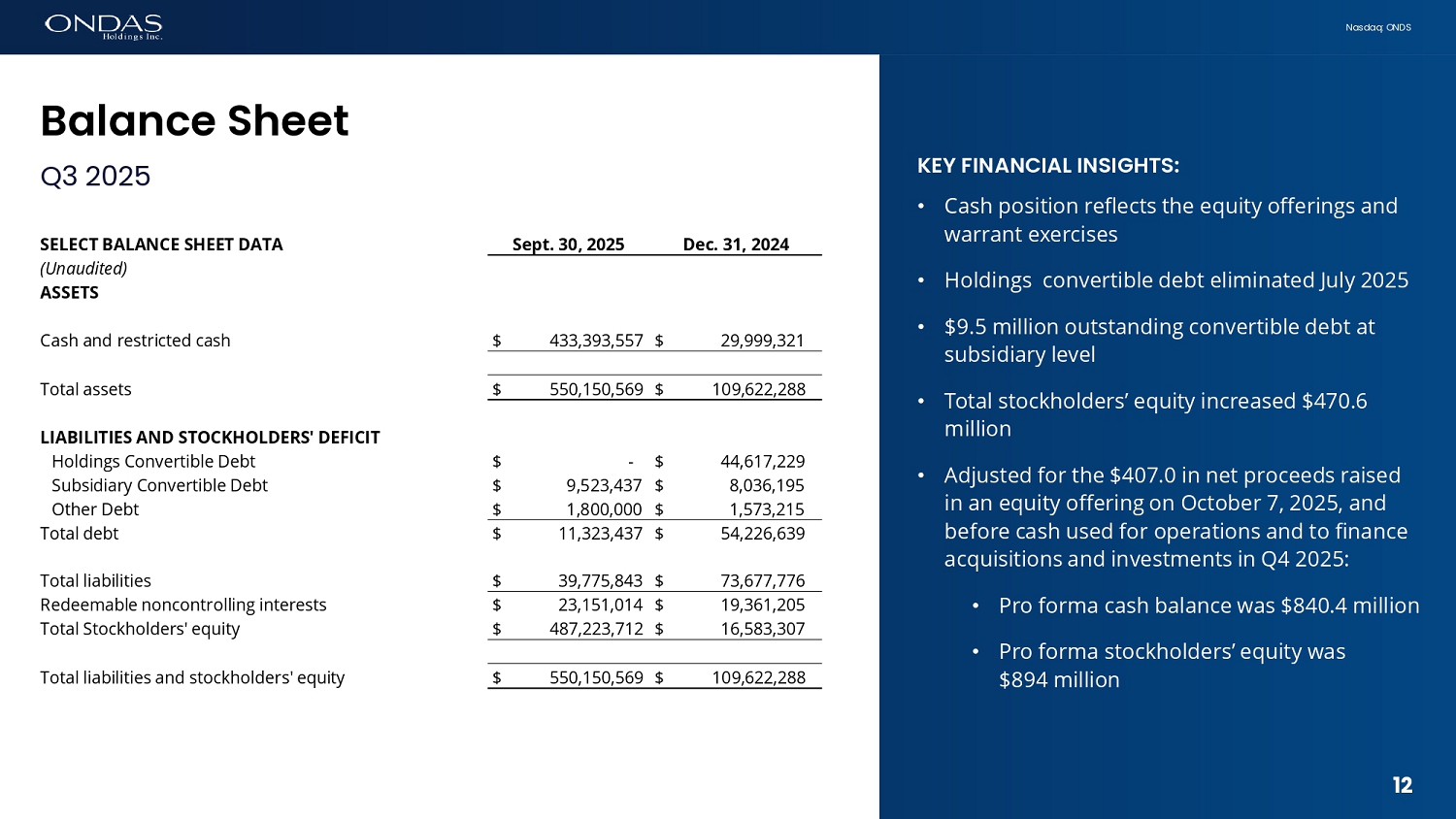 Nasdaq: ONDS KEY FINANCIAL INSIGHTS: • Cash balance of $433.4 million • Cash used in operating activities flat year - on - year • Cash used in investing activities includes strategic minority investments of $11.6 million and acquisitions of $6.5 million • Cash provided by financing through nine months ended September 30, 2025, includes: • $422.3 million YTD from the sale of stock and pre - funded warrants • $23.5 million in proceeds from exercised warrants and options STRATEGIC INVESTMENTS Fifi6fici6l Review Q3 2025 Nine Months Ended September 30, SELECT CASH FLOW DATA 2024 2025 (Unaudited) $ (25,360,649) $ (26,017,625) Net cash used in operating activities (1,659,366) (18,743,619) Net cash provided by (used in) investing activities 14,871,301 448,155,480 Net cash provided by financing activities (12,148,714) 403,394,236 Increase (Decrease) in cash, cash equivalents, and restricted cash 15,022,000 29,999,321 Cash, cash equivalents and restricted cash, beginning of period $ 2,873,286 $ 433,393,557 Cash, cash equivalents and restricted cash, end of period 11 11