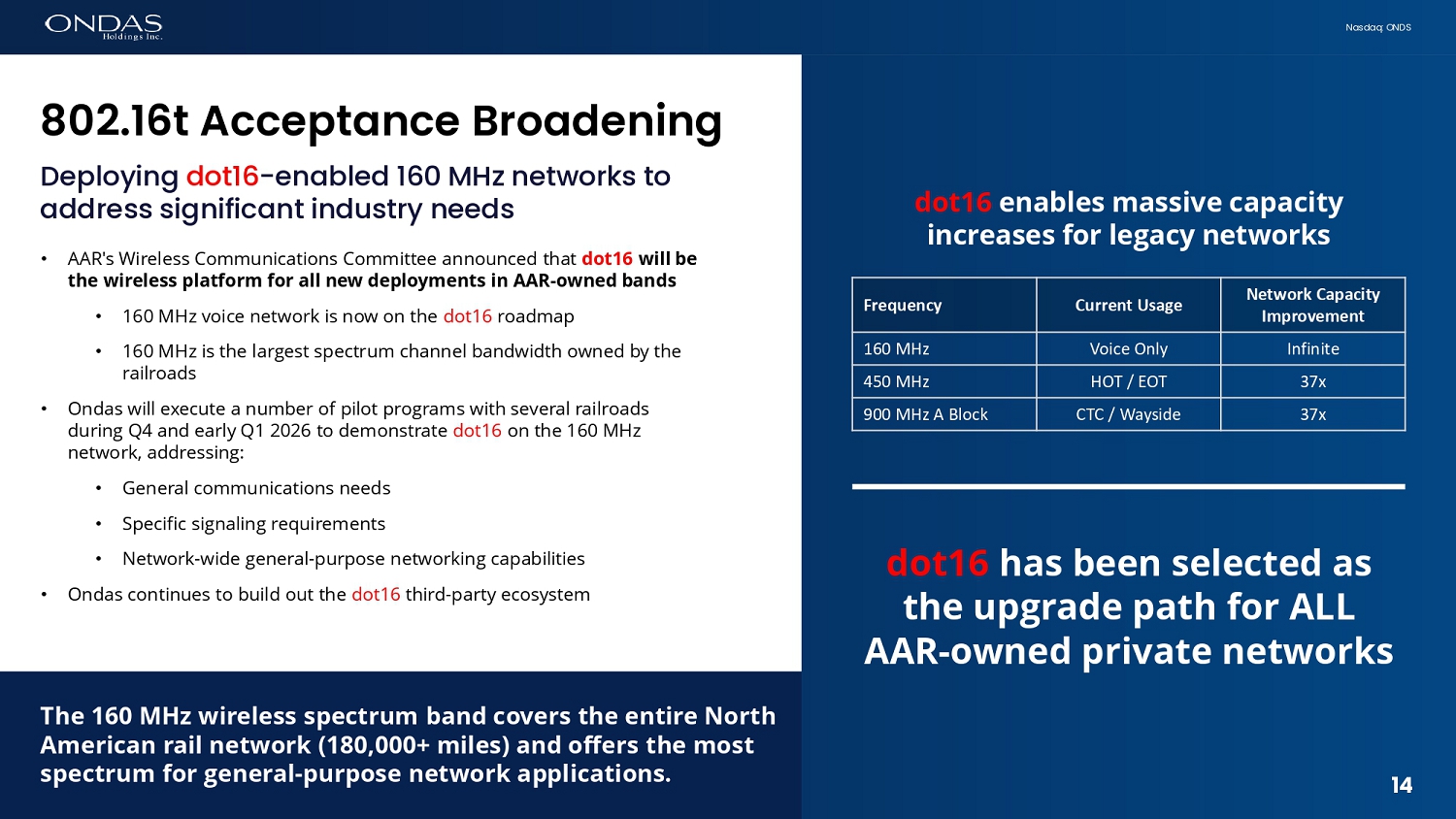 Nasdaq: ONDS Executiofi 6fid Outlook NEC Corridor and Indian radios entering shipping in Q4 • Northeast Corridor ACSES radios for Amtrak will start shipping during Q4 • We expect initial deliveries for Siemens India Head - of - Train radios to commence with the next few months • Next Generation Head - of - Train / End - of - Train ( NGHE ) is being accelerated by the Class 1s • AAR motivated to address performance and reliability concerns with legacy technology • Mitigate known security vulnerabilities with legacy equipment • WCC committed to finalize NGHE Generation 4 specifications in 2026 • Ondas is working with HOT / EOT manufacturers to be ready for commercialization • We continue to engage with the railroads on specific 900 MHz applications, though timelines of large network deployments remain uncertain • Work with specific railroads to accelerate 160 MHz adoption; execute initial application pilots in Q4 and early 2026 15