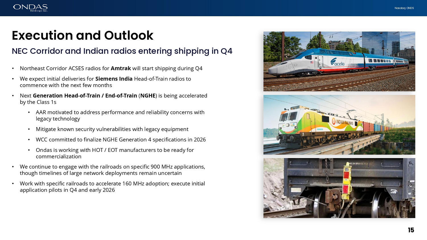 14 Nasdaq: ONDS 802.16t Accept6fice Bro6defiifig The 160 MHz wireless spectrum band covers the entire North American rail network (180,000+ miles) and offers the most spectrum for general - purpose network applications. dot16 enables massive capacity increases for legacy networks Network Capacity Improvement Current Usage Frequency Infinite Voice Only 160 MHz 37x HOT / EOT 450 MHz 37x CTC / Wayside 900 MHz A Block Deploying dot16 - enabled 160 MHz networks to address significant industry needs • AAR's Wireless Communications Committee announced that dot16 will be the wireless platform for all new deployments in AAR - owned bands • 160 MHz voice network is now on the dot16 roadmap • 160 MHz is the largest spectrum channel bandwidth owned by the railroads • Ondas will execute a number of pilot programs with several railroads during Q4 and early Q1 2026 to demonstrate dot16 on the 160 MHz network, addressing: • General communications needs • Specific signaling requirements • Network - wide general - purpose networking capabilities • Ondas continues to build out the dot16 third - party ecosystem dot16 has been selected as the upgrade path for ALL AAR - owned private networks 14