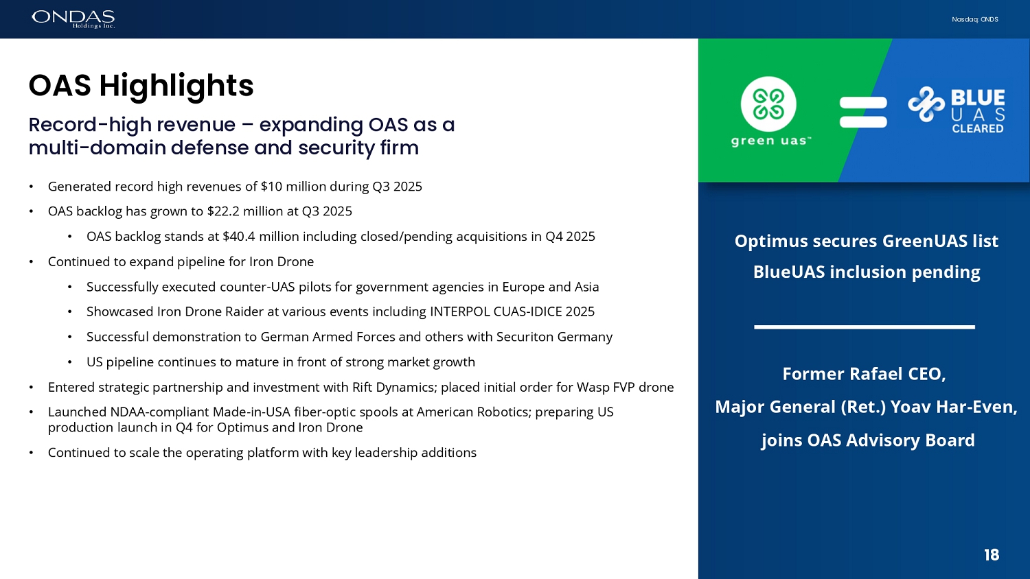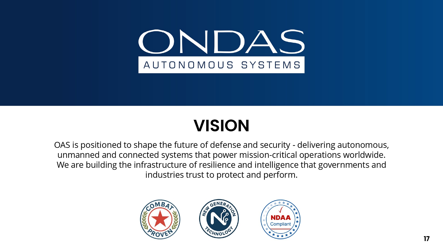 Nasdaq: ONDS VISION OAS is positioned to shape the future of defense and security - delivering autonomous, unmanned and connected systems that power mission - critical operations worldwide. We are building the infrastructure of resilience and intelligence that governments and industries trust to protect and perform. 17