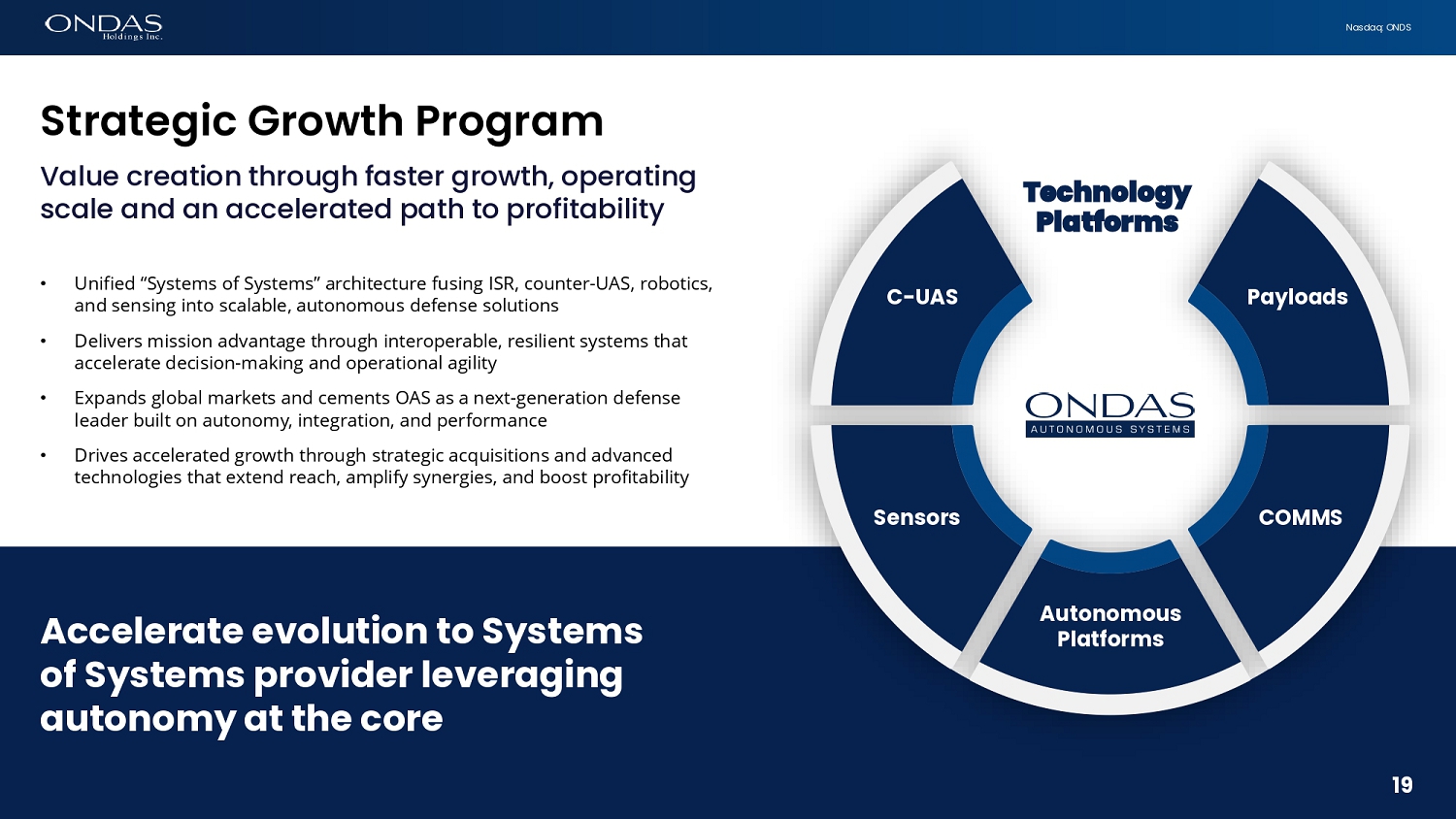 Nasdaq: ONDS Str6tegic Growth Progr6m Value creation through faster growth, operating scale and an accelerated path to profitability • Unified “Systems of Systems” architecture fusing ISR, counter - UAS, robotics, and sensing into scalable, autonomous defense solutions • Delivers mission advantage through interoperable, resilient systems that accelerate decision - making and operational agility • Expands global markets and cements OAS as a next - generation defense leader built on autonomy, integration, and performance • Drives accelerated growth through strategic acquisitions and advanced technologies that extend reach, amplify synergies, and boost profitability Autonomous Platforms Sensors Payloads COMMS C - UAS Technology Platforms 18 19 Accelerate evolution to Systems of Systems provider leveraging autonomy at the core
