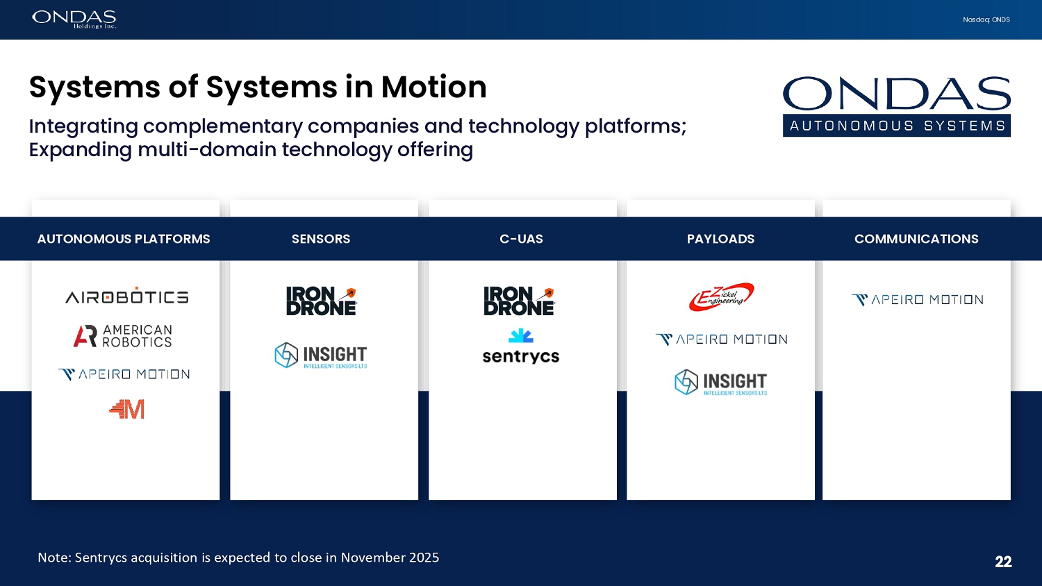 Nasdaq: ONDS Sc6lifig OAS’ Oper6tifig Pl6tform Enhancing talent and expanding ecosystem for operational scale OAS CORE T6lefi t Techfiolog y P6rtfier s ACQUIRED CAPABILITIES S6les Te6ms Customer s P6rtfier s Techfiolog y NEW TALENT Advisory Bo6rd Le6dership Te6m ECOSYSTEM M6fiuf6cturifi g Distributiof i Techfiolog y 21 INFRASTRUCTURE GO - TO - MARKET • Integrating OAS Core, acquisitions, new leadership and operational talent, and partners into a unified operating platform • Strengthening go - to - market through aligned sales teams, partnerships, and a global customer network • Deepening operations by integrating manufacturing, distribution, and technology across OAS • Expanding leadership and advisory depth at OAS to drive execution, governance, and coordination • Investing in talent and technology to accelerate innovation and scalability • Building a connected ecosystem for collaboration, efficiency, and rapid commercialization