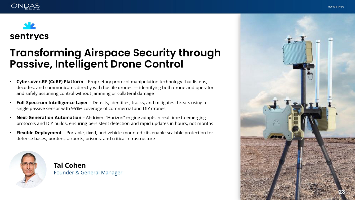 22 Nasdaq: ONDS 22 Systems of Systems ifi Motiofi Integrating complementary companies and technology platforms; Expanding multi - domain technology offering COMMUNICATIONS AUTONOMOUS PLATFORMS SENSORS C - UAS PAYLOADS Note: Sentrycs acquisition is expected to close in November 2025