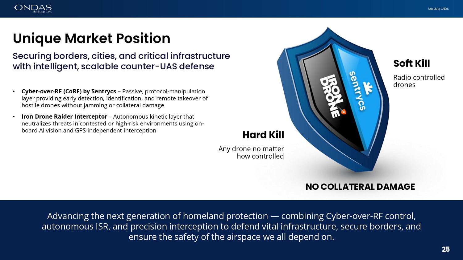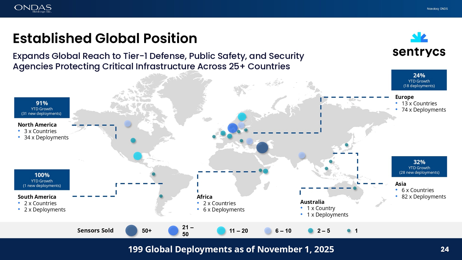 24 Nasdaq: ONDS 199 Global Deployments as of November 1, 2025 Sensors Sold 1 11 – 20 6 – 10 2 – 5 21 – 50 50+ North America • 3 x Countries • 34 x Deployments South America • 2 x Countries • 2 x Deployments Europe • 13 x Countries • 74 x Deployments Australia • 1 x Country • 1 x Deployments Africa • 2 x Countries • 6 x Deployments Asia • 6 x Countries • 82 x Deployments 91% YTD Growth (31 new deployments) ) 100% YTD Growth (1 new deployments) 24% YTD Growth (18 deployments) 32% YTD Growth (28 new deployments) 24 Est6blished Glob6l Positiofi Expands Global Reach to Tier - 1 Defense, Public Safety, and Security Agencies Protecting Critical Infrastructure Across 25+ Countries