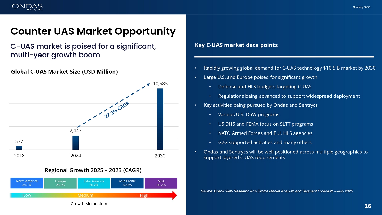 26 Nasdaq: ONDS Source: Grand View Research Anti - Drome Market Analysis and Segment Forecasts – July 2025. 2018 2030 577 2,447 2024 MEA 30.2% Asia Pacific 30.6% Latin America 30.2% Europe 28.2% North America 24.1% Regional Growth 2025 – 2023 (CAGR) High Low Medium Growth Momentum Coufiter UAS M6rket Opportufiity C - UAS market is poised for a significant, multi - year growth boom Global C - UAS Market Size (USD Million) 10,585 • Rapidly growing global demand for C - UAS technology $10.5 B market by 2030 • Large U.S. and Europe poised for significant growth • Defense and HLS budgets targeting C - UAS • Regulations being advanced to support widespread deployment • Key activities being pursued by Ondas and Sentrycs • Various U.S. DoW programs • US DHS and FEMA focus on SLTT programs • NATO Armed Forces and E.U. HLS agencies • G2G supported activities and many others • Ondas and Sentrycs will be well positioned across multiple geographies to support layered C - UAS requirements Key C - UAS market data points 26