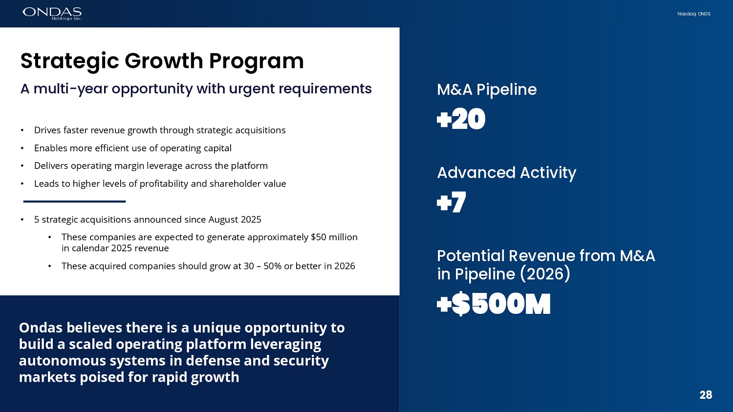 Nasdaq: ONDS Str6tegic Growth Progr6m A multi - year opportunity with urgent requirements • Drives faster revenue growth through strategic acquisitions • Enables more efficient use of operating capital • Delivers operating margin leverage across the platform • Leads to higher levels of profitability and shareholder value • 5 strategic acquisitions announced since August 2025 • These companies are expected to generate approximately $50 million in calendar 2025 revenue • These acquired companies should grow at 30 – 50% or better in 2026 M&A Pipeline +fi0 Advanced Activity +7 Potential Revenue from M&A in Pipeline (2026) +$500M Ondas believes there is a unique opportunity to build a scaled operating platform leveraging autonomous systems in defense and security markets poised for rapid growth 28 28