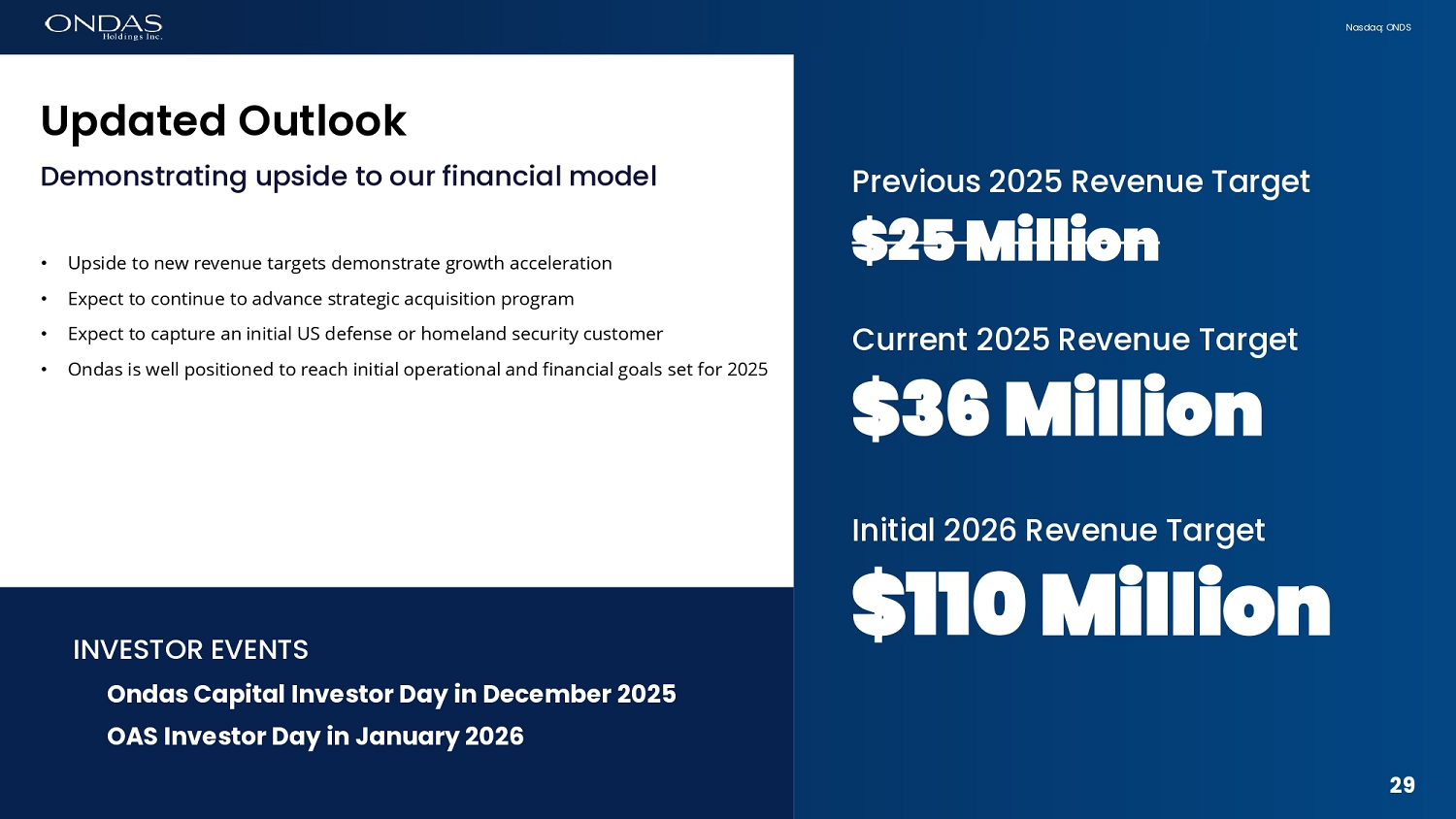 Nasdaq: ONDS Upd6ted Outlook Demonstrating upside to our financial model • Upside to new revenue targets demonstrate growth acceleration • Expect to continue to advance strategic acquisition program • Expect to capture an initial US defense or homeland security customer • Ondas is well positioned to reach initial operational and financial goals set for 2025 Previous 2025 Revenue Target $fi5 Million Current 2025 Revenue Target $36 Million Initial 2026 Revenue Target $110 Million INVESTOR EVENTS Ondas Capital Investor Day in December 2025 OAS Investor Day in January 2026 28 29