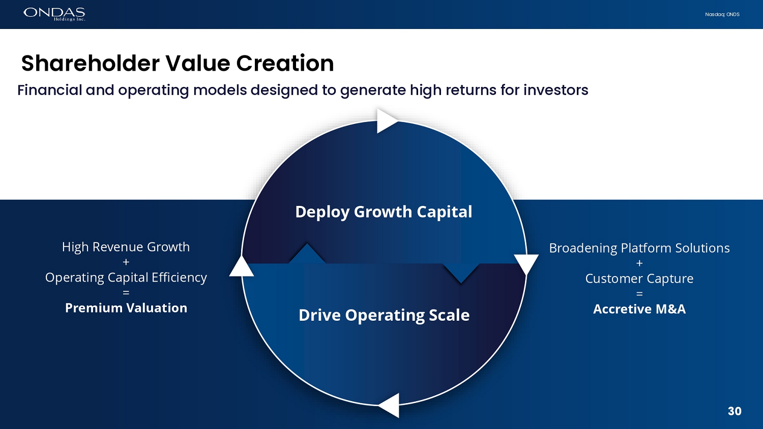 Nasdaq: ONDS Sh6reholder V6lue Cre6tiofi Financial and operating models designed to generate high returns for investors High Revenue Growth + Operating Capital Efficiency = Premium Valuation Broadening Platform Solutions + Customer Capture = Accretive M&A Deploy Growth Capital Drive Operating Scale 28 30