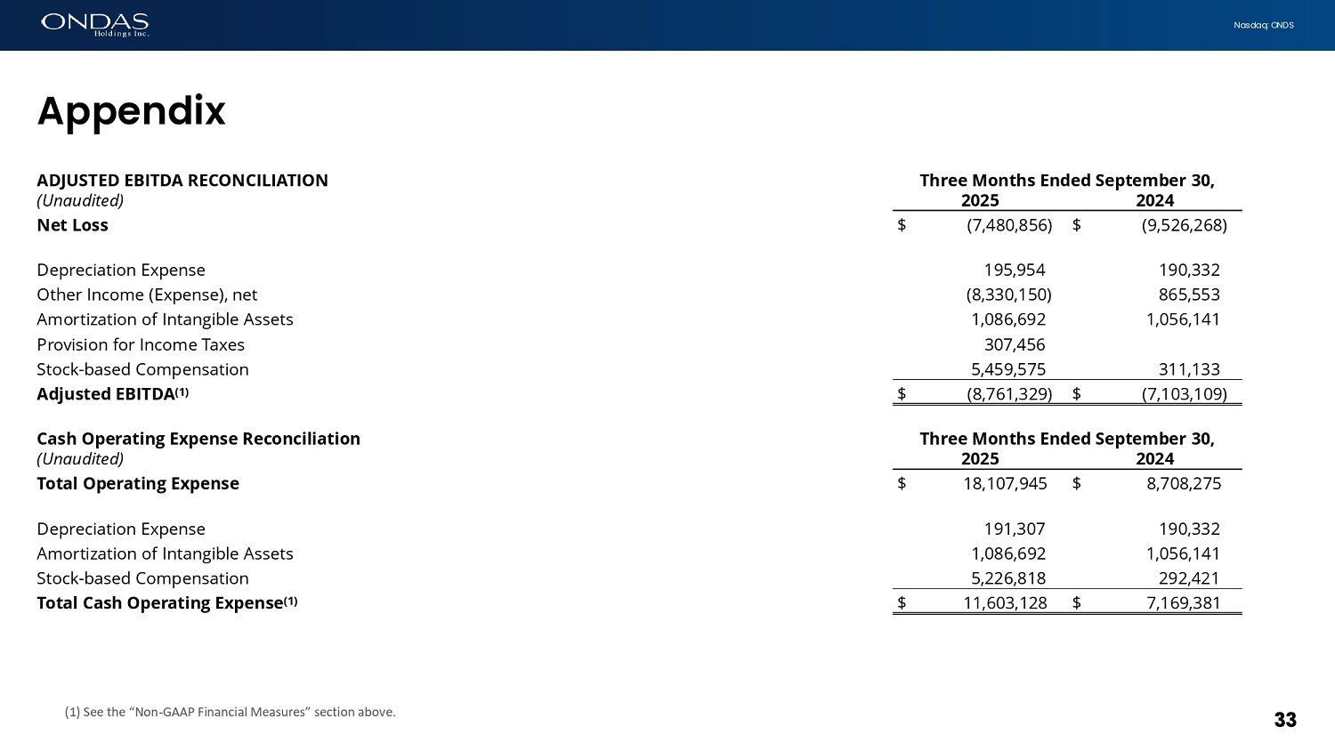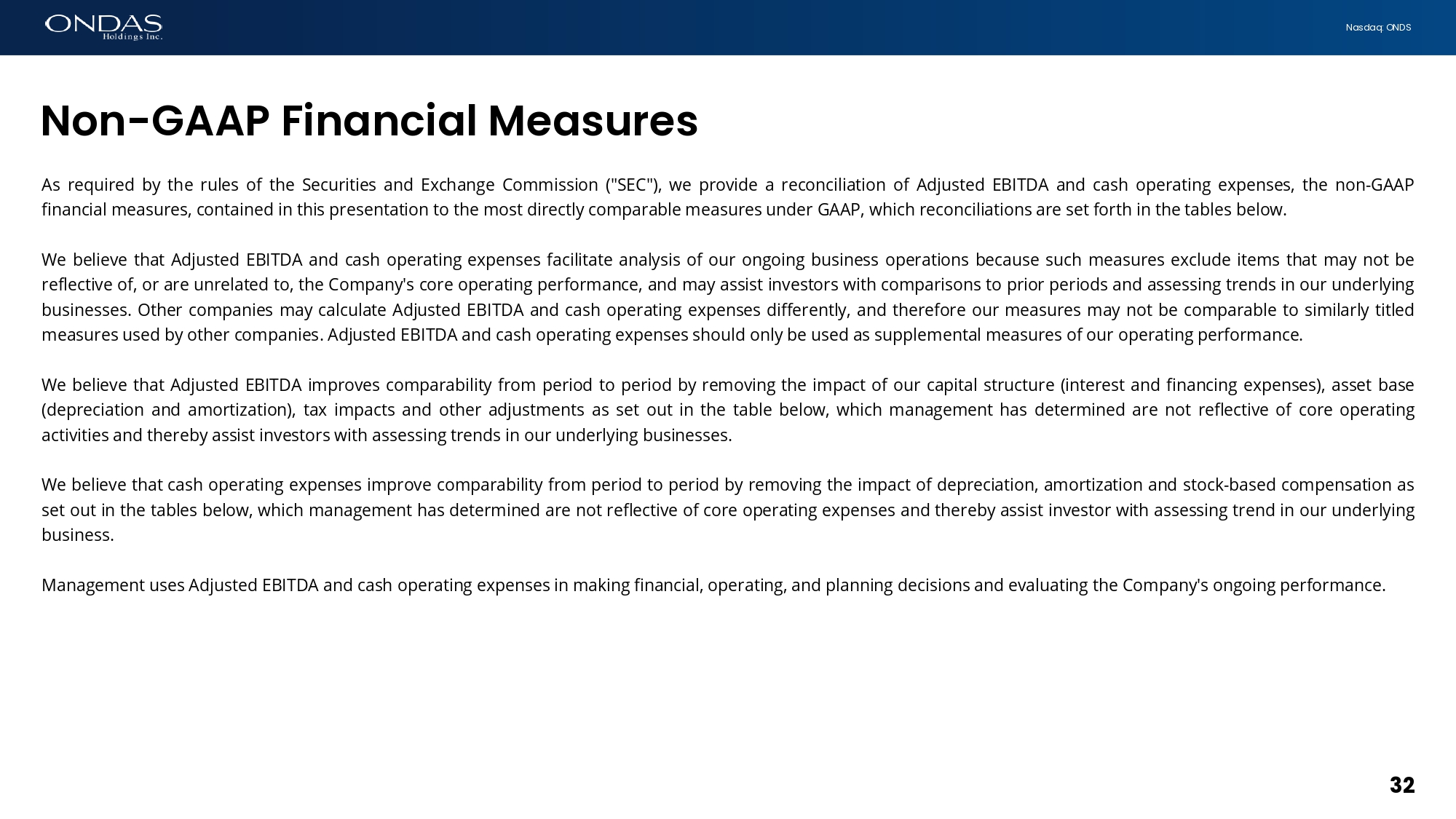 Nasdaq: ONDS As required by the rules of the Securities and Exchange Commission ("SEC"), we provide a reconciliation of Adjusted EBITDA and cash operating expenses, the non - GAAP financial measures, contained in this presentation to the most directly comparable measures under GAAP, which reconciliations are set forth in the tables below . We believe that Adjusted EBITDA and cash operating expenses facilitate analysis of our ongoing business operations because such measures exclude items that may not be reflective of, or are unrelated to, the Company's core operating performance, and may assist investors with comparisons to prior periods and assessing trends in our underlying businesses . Other companies may calculate Adjusted EBITDA and cash operating expenses differently, and therefore our measures may not be comparable to similarly titled measures used by other companies . Adjusted EBITDA and cash operating expenses should only be used as supplemental measures of our operating performance . We believe that Adjusted EBITDA improves comparability from period to period by removing the impact of our capital structure (interest and financing expenses), asset base (depreciation and amortization), tax impacts and other adjustments as set out in the table below, which management has determined are not reflective of core operating activities and thereby assist investors with assessing trends in our underlying businesses . We believe that cash operating expenses improve comparability from period to period by removing the impact of depreciation, amortization and stock - based compensation as set out in the tables below, which management has determined are not reflective of core operating expenses and thereby assist investor with assessing trend in our underlying business . Management uses Adjusted EBITDA and cash operating expenses in making financial, operating, and planning decisions and evaluating the Company's ongoing performance . 32 Nofi - GAAP Fifi6fici6l Me6sures