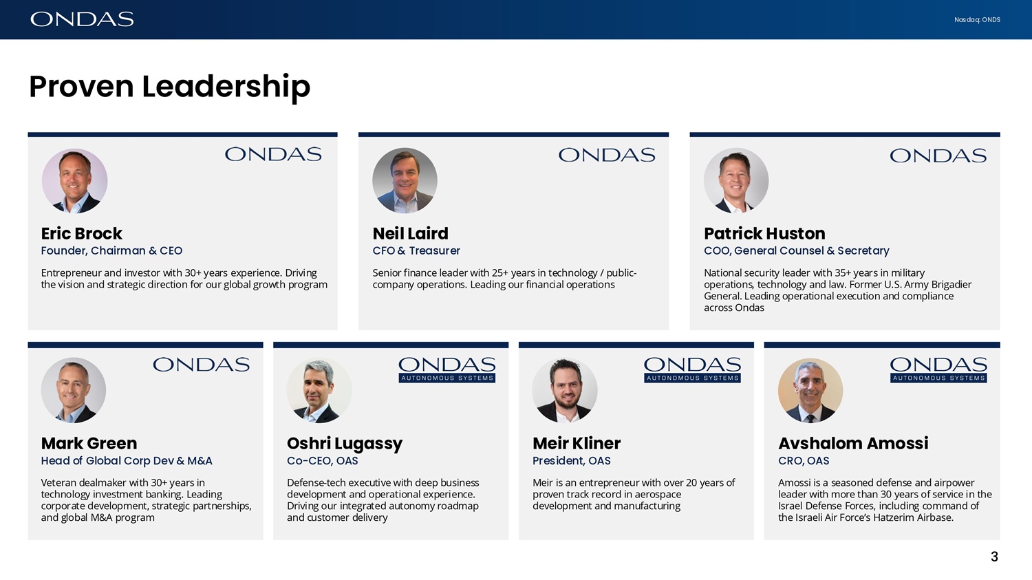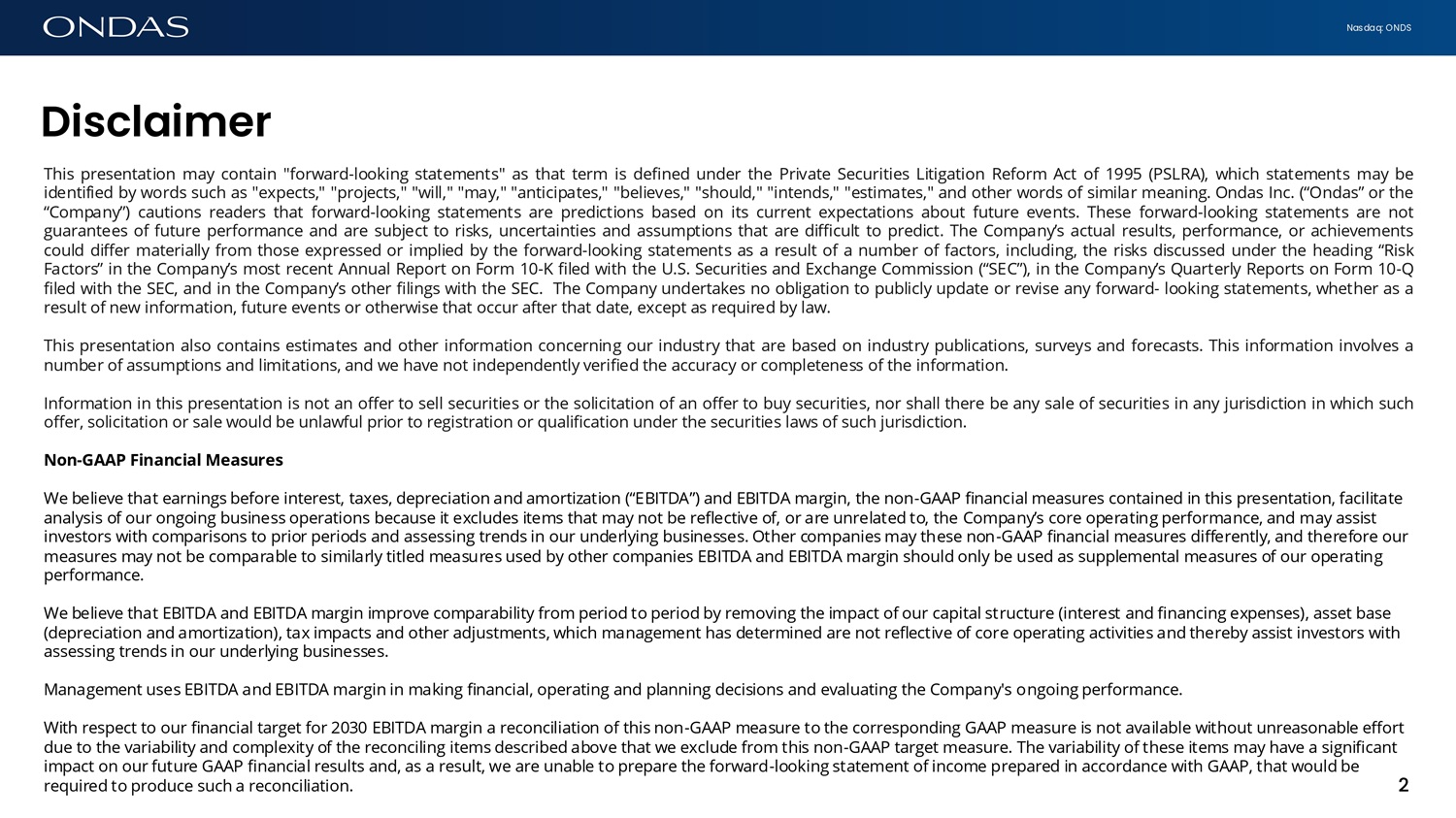 Nasdaq: ONDS 2 This presentation may contain "forward - looking statements" as that term is defined under the Private Securities Litigation Reform Act of 1995 (PSLRA), which statements may be identified by words such as "expects," "projects," "will," "may," "anticipates," "believes," "should," "intends," "estimates," and other words of similar meaning . Ondas Inc . (“Ondas” or the “Company”) cautions readers that forward - looking statements are predictions based on its current expectations about future events . These forward - looking statements are not guarantees of future performance and are subject to risks, uncertainties and assumptions that are difficult to predict . The Company’s actual results, performance, or achievements could differ materially from those expressed or implied by the forward - looking statements as a result of a number of factors, including, the risks discussed under the heading “Risk Factors” in the Company’s most recent Annual Report on Form 10 - K filed with the U . S . Securities and Exchange Commission (“SEC”), in the Company’s Quarterly Reports on Form 10 - Q filed with the SEC, and in the Company’s other filings with the SEC . The Company undertakes no obligation to publicly update or revise any forward - looking statements, whether as a result of new information, future events or otherwise that occur after that date, except as required by law . This presentation also contains estimates and other information concerning our industry that are based on industry publications, surveys and forecasts . This information involves a number of assumptions and limitations, and we have not independently verified the accuracy or completeness of the information . Information in this presentation is not an offer to sell securities or the solicitation of an offer to buy securities, nor shall there be any sale of securities in any jurisdiction in which such offer, solicitation or sale would be unlawful prior to registration or qualification under the securities laws of such jurisdiction . Non - GAAP Financial Measures We believe that earnings before interest, taxes, depreciation and amortization (“EBITDA”) and EBITDA margin, the non - GAAP financial measures contained in this presentation, facilitate analysis of our ongoing business operations because it excludes items that may not be reflective of, or are unrelated to, the Company’s core operating performance, and may assist investors with comparisons to prior periods and assessing trends in our underlying businesses. Other companies may these non - GAAP financial measures differently, and therefore our measures may not be comparable to similarly titled measures used by other companies EBITDA and EBITDA margin should only be used as supplemental measures of our operating performance. We believe that EBITDA and EBITDA margin improve comparability from period to period by removing the impact of our capital structure (interest and financing expenses), asset base (depreciation and amortization), tax impacts and other adjustments, which management has determined are not reflective of core operating activities and thereby assist investors with assessing trends in our underlying businesses. Management uses EBITDA and EBITDA margin in making financial, operating and planning decisions and evaluating the Company's ongoing performance. With respect to our financial target for 2030 EBITDA margin a reconciliation of this non - GAAP measure to the corresponding GAAP measure is not available without unreasonable effort due to the variability and complexity of the reconciling items described above that we exclude from this non - GAAP target measure. The variability of these items may have a significant impact on our future GAAP financial results and, as a result, we are unable to prepare the forward - looking statement of income prepared in accordance with GAAP, that would be required to produce such a reconciliation. Discl6imer