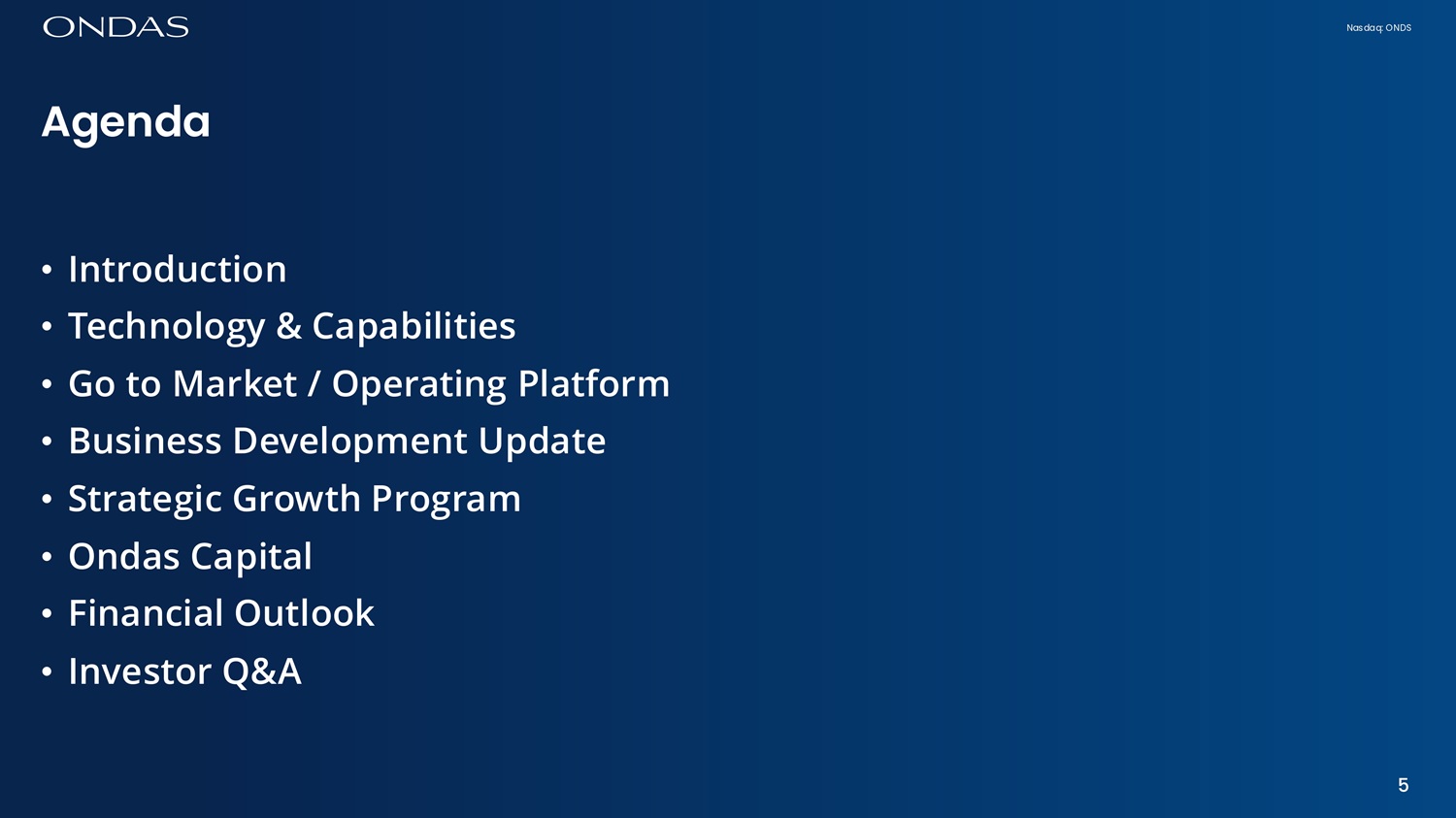 Nasdaq: ONDS • Introduction • Technology & Capabilities • Go to Market / Operating Platform • Business Development Update • Strategic Growth Program • Ondas Capital • Financial Outlook • Investor Q&A 5 Agefid6