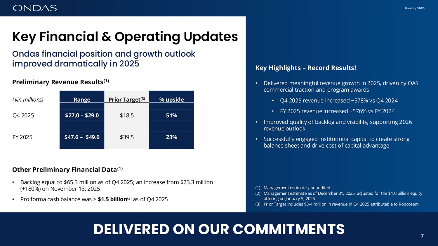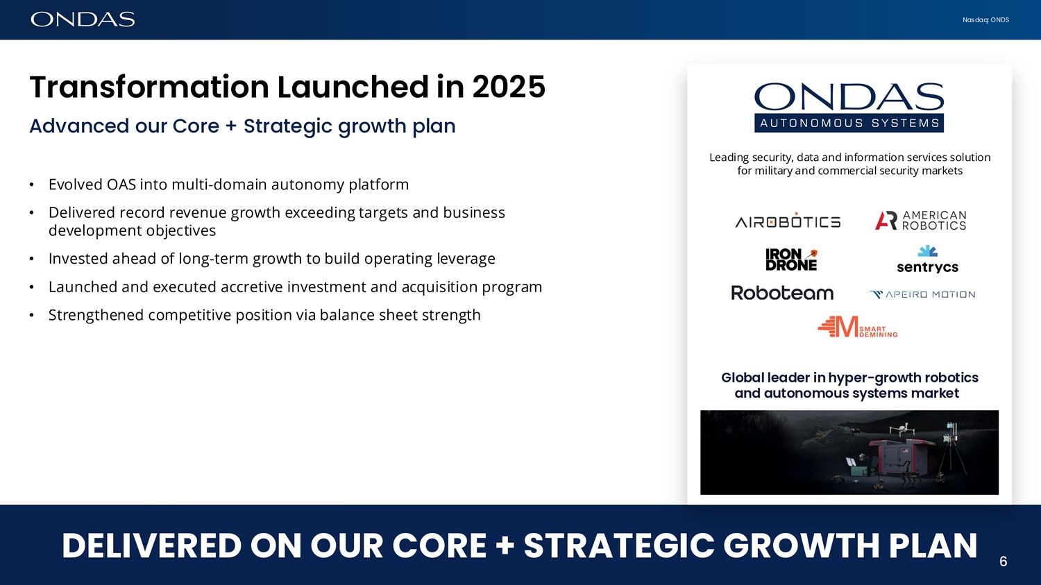Nasdaq: ONDS 6 Tr6fisform6tiofi L6ufiched ifi 2025 Advanced our Core + Strategic growth plan DELIVERED ON OUR CORE + STRATEGIC GROWTH PLAN • Evolved OAS into multi - domain autonomy platform • Delivered record revenue growth exceeding targets and business development objectives • Invested ahead of long - term growth to build operating leverage • Launched and executed accretive investment and acquisition program • Strengthened competitive position via balance sheet strength Leading security, data and information services solution for military and commercial security markets Glob6l le6der ifi hyper - growth robotics 6fid 6utofiomous systems m6rket 6
