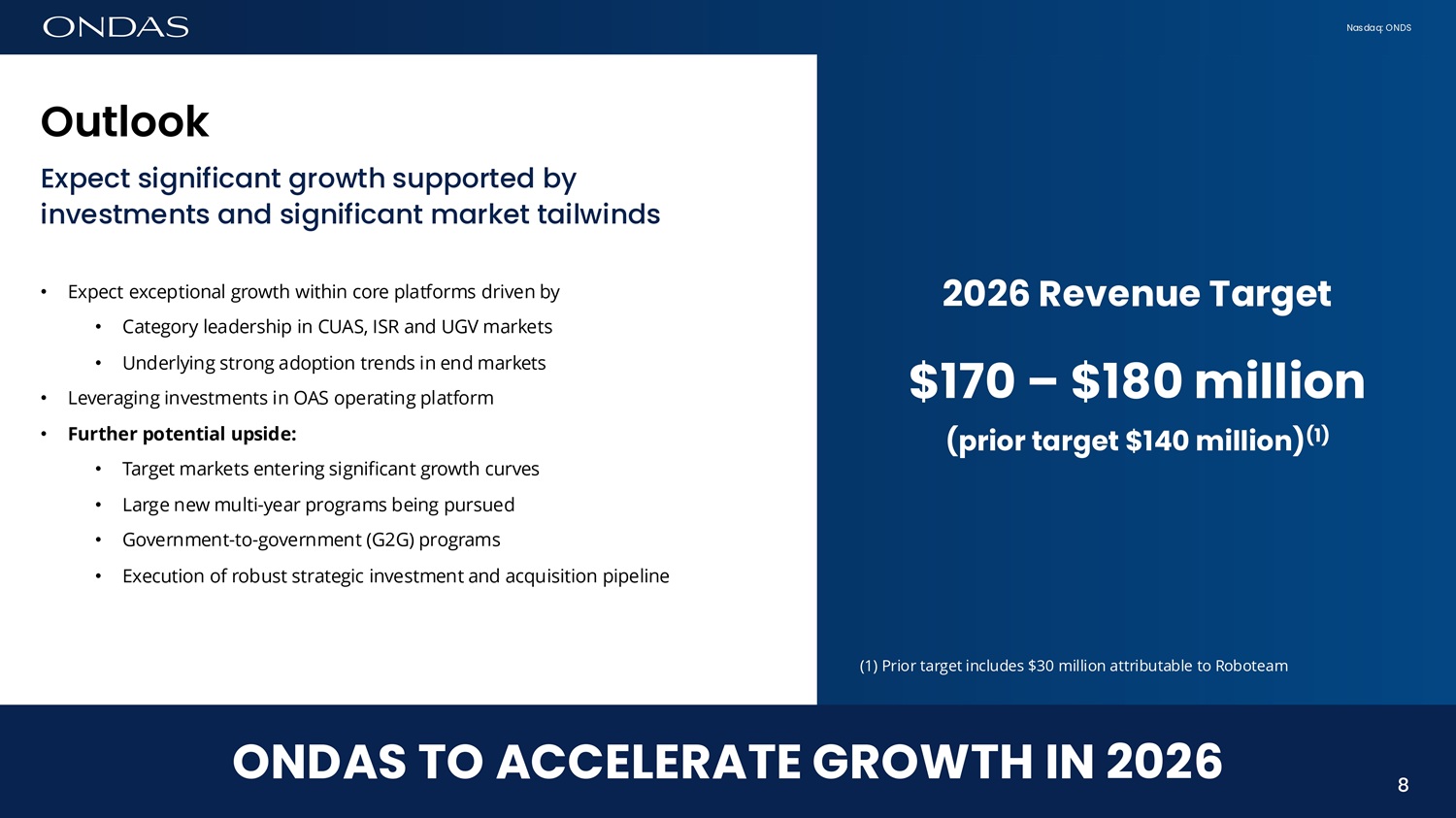 Nasdaq: ONDS Key Highlights – Record Results! • Delivered meaningful revenue growth in 2025, driven by OAS commercial traction and program awards • Q4 2025 revenue increased ~578% vs Q4 2024 • FY 2025 revenue increased ~576% vs FY 2024 • Improved quality of backlog and visibility, supporting 2026 revenue outlook • Successfully engaged institutional capital to create strong balance sheet and drive cost of capital advantage 7 DELIVERED ON OUR COMMITMENTS 7 % upside Prior Target (3) Range ($in millions) 51% $18.5 $27.0 – $29.0 Q4 2025 23% $39.5 $47.6 – $49.6 FY 2025 Other Preliminary Financial Data (1) • Backlog equal to $65.3 million as of Q4 2025; an increase from $23.3 million (+180%) on November 13, 2025 • Pro forma cash balance was > $1.5 billion (2) as of Q4 2025 (1) Management estimates, unaudited (2) Management estimate as of December 31, 2025, adjusted for the $1.0 billion equity offering on January 9, 2025 (3) Prior Target includes $3 - 4 million in revenue in Q4 2025 attributable to Roboteam Key Fifi6fici6l & Oper6tifig Upd6tes Ondas financial position and growth outlook improved dramatically in 2025 Preliminary Revenue Results (1)