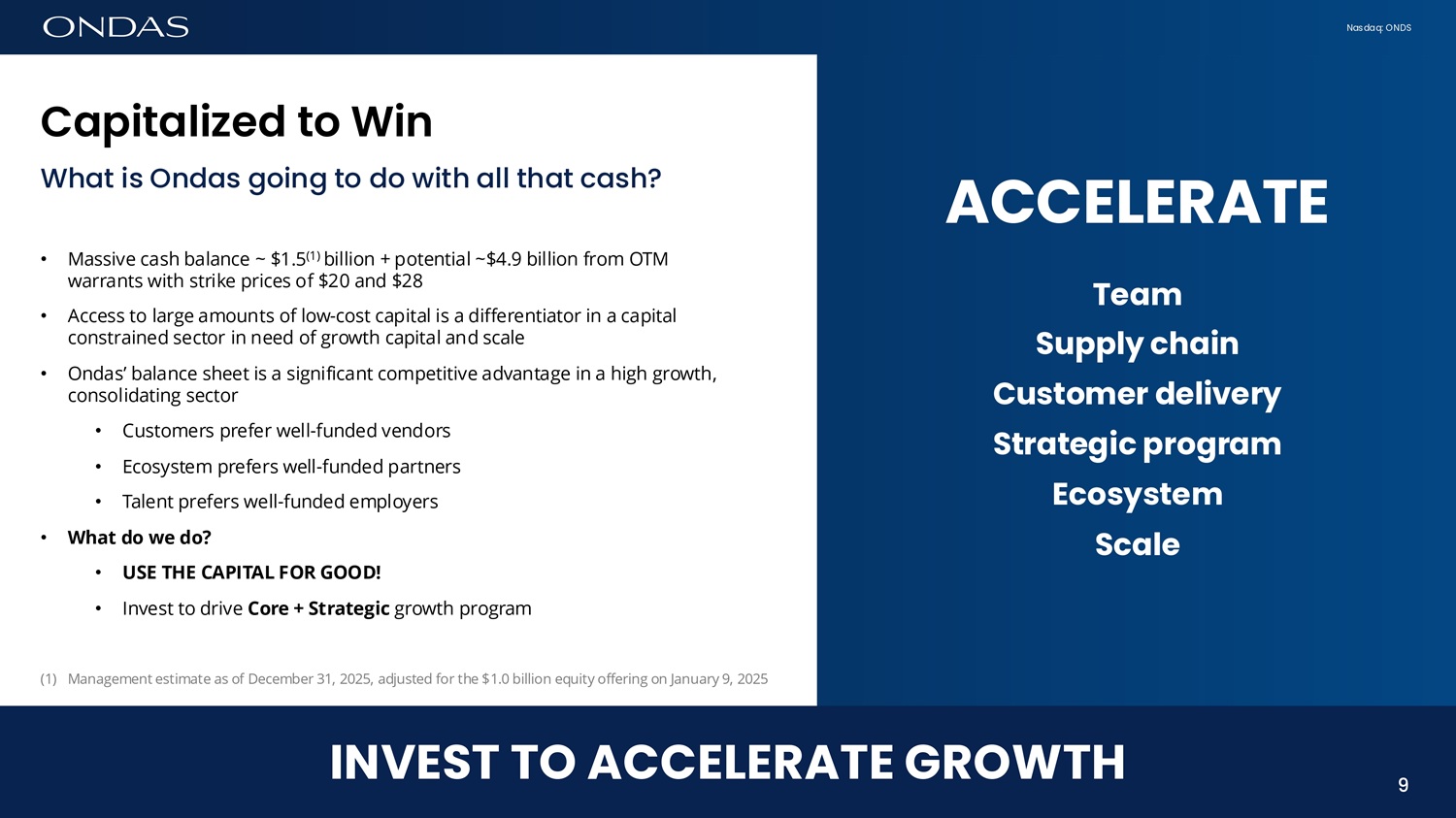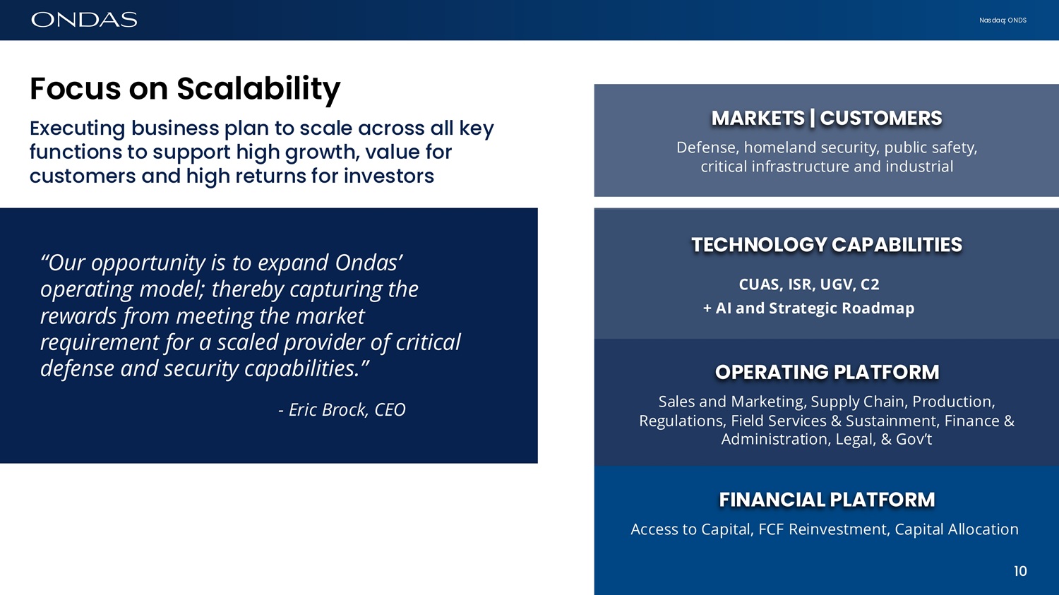 Nasdaq: ONDS ACCELERATE Team Supply chain Customer delivery Strategic program Ecosystem Scale C6pit6lized to Wifi What is Ondas going to do with all that cash? • Massive cash balance ~ $1.5 (1) billion + potential ~$4.9 billion from OTM warrants with strike prices of $20 and $28 • Access to large amounts of low - cost capital is a differentiator in a capital constrained sector in need of growth capital and scale • Ondas’ balance sheet is a significant competitive advantage in a high growth, consolidating sector • Customers prefer well - funded vendors • Ecosystem prefers well - funded partners • Talent prefers well - funded employers • What do we do? • USE THE CAPITAL FOR GOOD! • Invest to drive Core + Strategic growth program (1) Management estimate as of December 31, 2025, adjusted for the $1.0 billion equity offering on January 9, 2025 9 INVEST TO ACCELERATE GROWTH 9