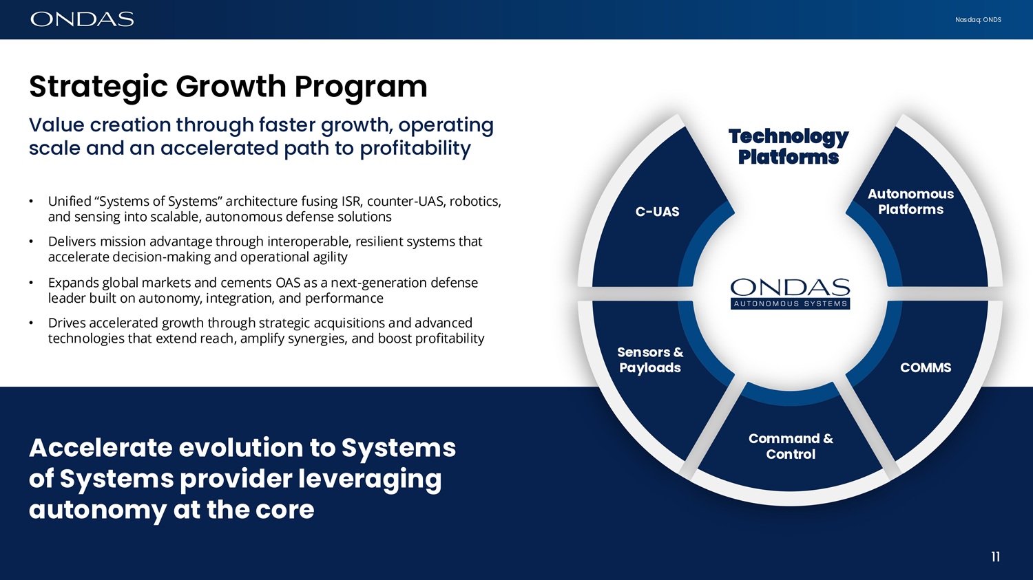 Nasdaq: ONDS Focus ofi Sc6l6bility Executing business plan to scale across all key functions to support high growth, value for customers and high returns for investors MARKETS | CUSTOMERS Defense, homeland security, public safety, critical infrastructure and industrial OPERATING PLATFORM Sales and Marketing, Supply Chain, Production, Regulations, Field Services & Sustainment, Finance & Administration, Legal, & Gov’t FINANCIAL PLATFORM Access to Capital, FCF Reinvestment, Capital Allocation 10 10 TECHNOLOGY CAPABILITIES CUAS, ISR, UGV, C2 + AI and Strategic Roadmap “Our opportunity is to expand Ondas’ operating model; thereby capturing the rewards from meeting the market requirement for a scaled provider of critical defense and security capabilities.” - Eric Brock, CEO