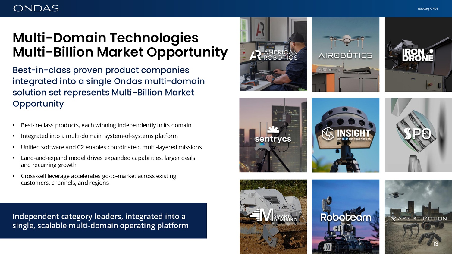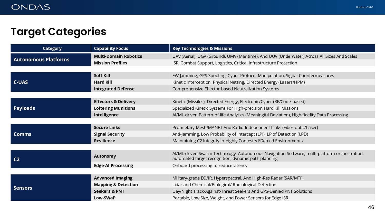 Nasdaq: ONDS T6rget C6tegories Key Technologies & Missions Capability Focus Category Multi - Domain Robotics UAV (Aerial), UGV (Ground), UMV (Maritime), And UUV (Underwater) Across All Sizes And Scales Autonomous Platforms Mission Profiles ISR, Combat Support, Logistics, Critical Infrastructure Protection Soft Kill EW Jamming, GPS Spoofing, Cyber Protocol Manipulation, Signal Countermeasures C - UAS Hard Kill Kinetic Interception, Physical Netting, Directed Energy (Lasers/HPM) Integrated Defense Comprehensive Effector - based Neutralization Systems Effectors & Delivery Kinetic (Missiles), Directed Energy, Electronic/Cyber (RF/Code - based) Payloads Loitering Munitions Specialized Kinetic Systems For High - precision Hard Kill Missions Intelligence AI/ML - driven Pattern - of - life Analytics (Meaningful Deviation), High - fidelity Data Processing Secure Links Proprietary Mesh/MANET And Radio - Independent Links (Fiber - optic/Laser) Comms Signal Security Anti - Jamming, Low Probability of Intercept (LPI), LP of Detection (LPD) Resilience Maintaining C2 Integrity in Highly Contested/Denied Environments Military - grade EO/IR, Hyperspectral, And High - Res Radar (SAR/MTI) Advanced Imaging Sensors Lidar and Chemical/Biological/ Radiological Detection Mapping & Detection Day/Night Track - Against - Threat Seekers And GPS - Denied PNT Solutions Seekers & PNT Portable, Low Size, Weight, and Power Sensors for Edge ISR Low - SWaP 46 C2 Autonomy AI/ML - driven Swarm Technology, Autonomous Navigation Software, multi - platform orchestration, automated target recognition, dynamic path planning Edge - AI Processing Onboard processing to reduce latency