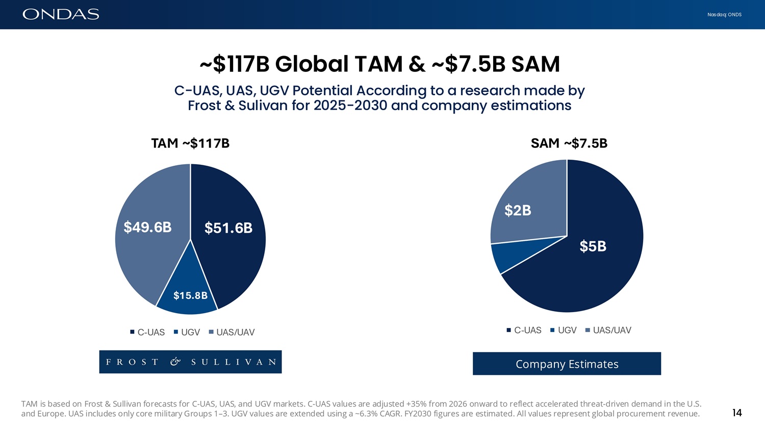Nasdaq: ONDS 13 Multi - Dom6ifi Techfiologies Multi - Billiofi M6rket Opportufiity Best - in - class proven product companies integrated into a single Ondas multi - domain solution set represents Multi - Billion Market Opportunity • Best - in - class products, each winning independently in its domain • Integrated into a multi - domain, system - of - systems platform • Unified software and C2 enables coordinated, multi - layered missions • Land - and - expand model drives expanded capabilities, larger deals and recurring growth • Cross - sell leverage accelerates go - to - market across existing customers, channels, and regions Independent category leaders, integrated into a single, scalable multi - domain operating platform 13