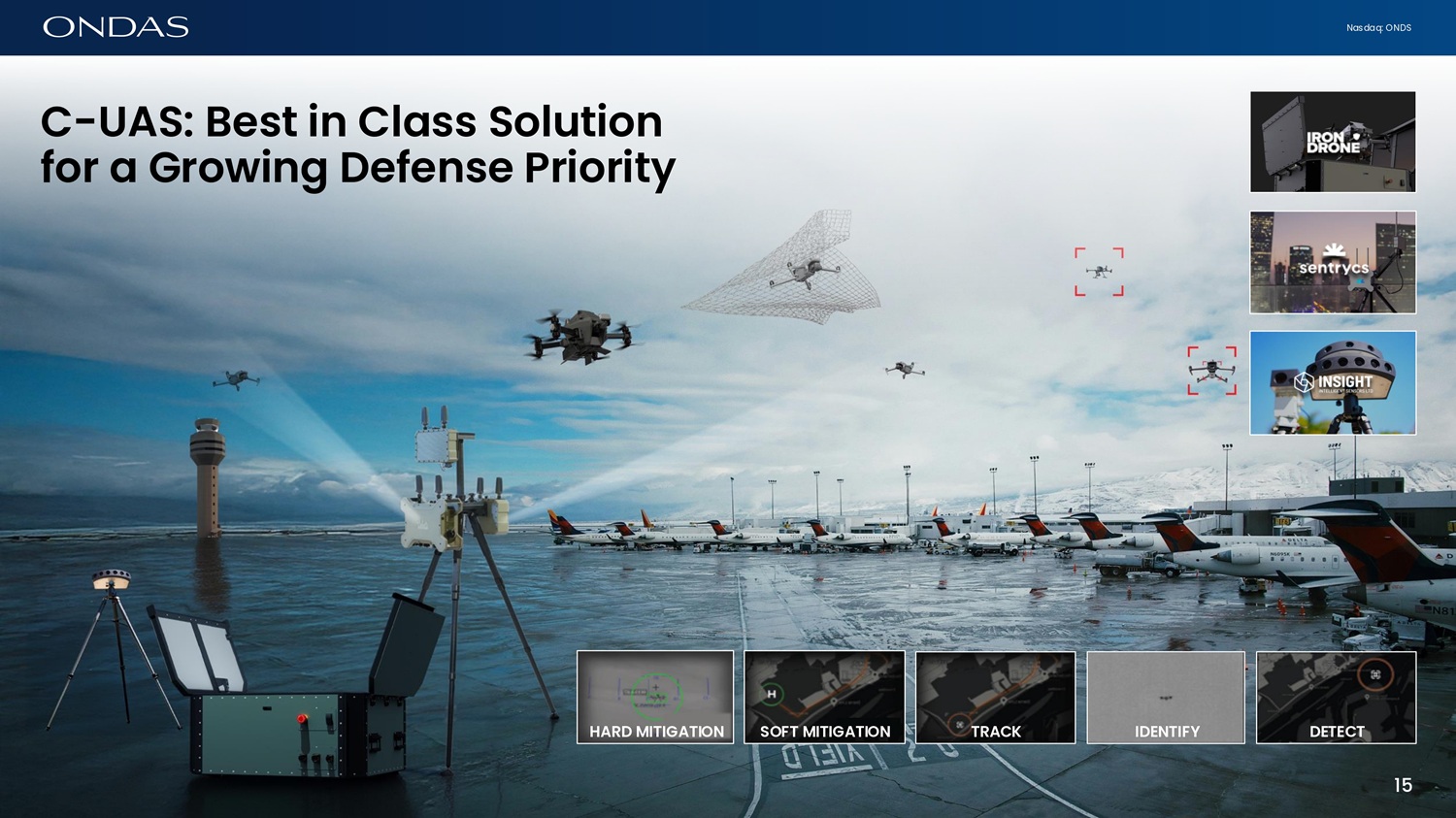 Nasdaq: ONDS C - UAS: Best ifi Cl6ss Solutiofi for 6 Growifig Defefise Priority DETECT 15 15 IDENTIFY TRACK SOFT MITIGATION HARD MITIGATION
