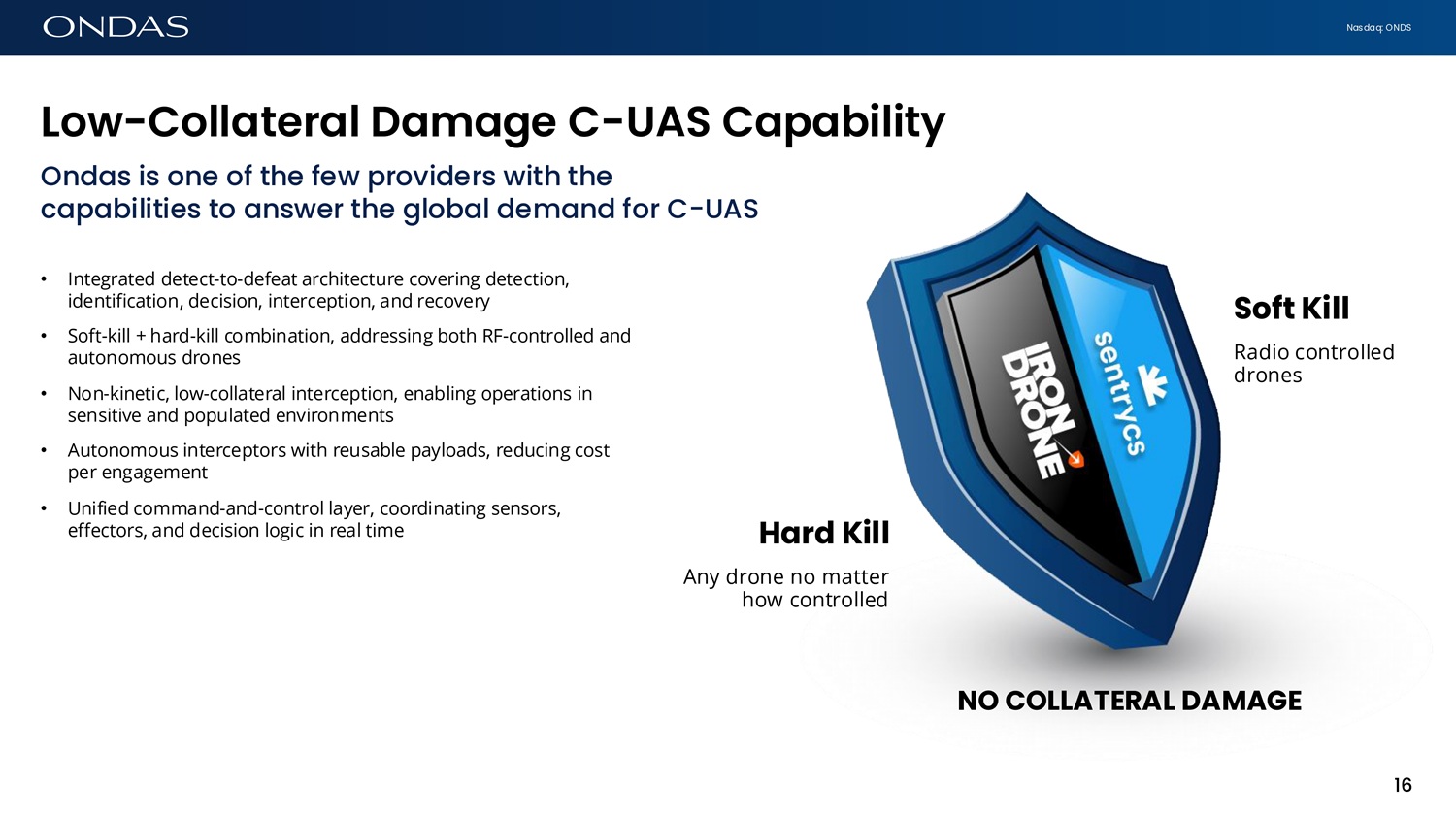 Nasdaq: ONDS Low - Coll6ter6l D6m6ge C - UAS C6p6bility Ondas is one of the few providers with the capabilities to answer the global demand for C - UAS • Integrated detect - to - defeat architecture covering detection, identification, decision, interception, and recovery • Soft - kill + hard - kill combination, addressing both RF - controlled and autonomous drones • Non - kinetic, low - collateral interception, enabling operations in sensitive and populated environments • Autonomous interceptors with reusable payloads, reducing cost per engagement • Unified command - and - control layer, coordinating sensors, effectors, and decision logic in real time Hard Kill Any drone no matter how controlled 16 Soft Kill Radio controlled drones NO COLLATERAL DAMAGE