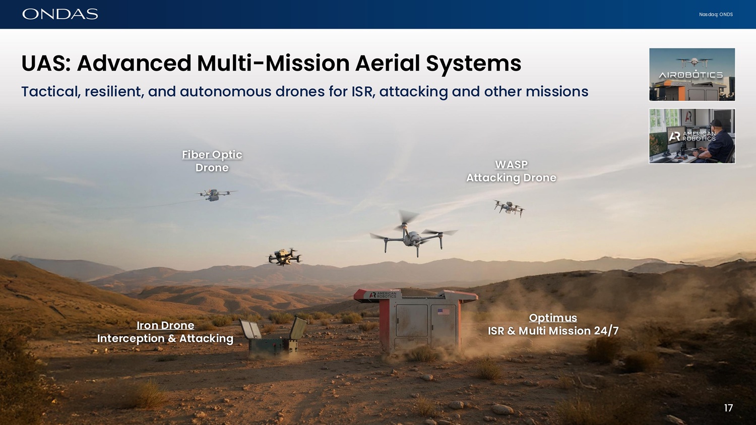 Nasdaq: ONDS UAS: Adv6ficed Multi - Missiofi Aeri6l Systems Tactical, resilient, and autonomous drones for ISR, attacking and other missions Fiber Optic Drofie Irofi Drofie Ifiterceptiofi & Att6ckifig WASP Att6ckifig Drofie Optimus ISR & Multi Missiofi 24/7 17 17