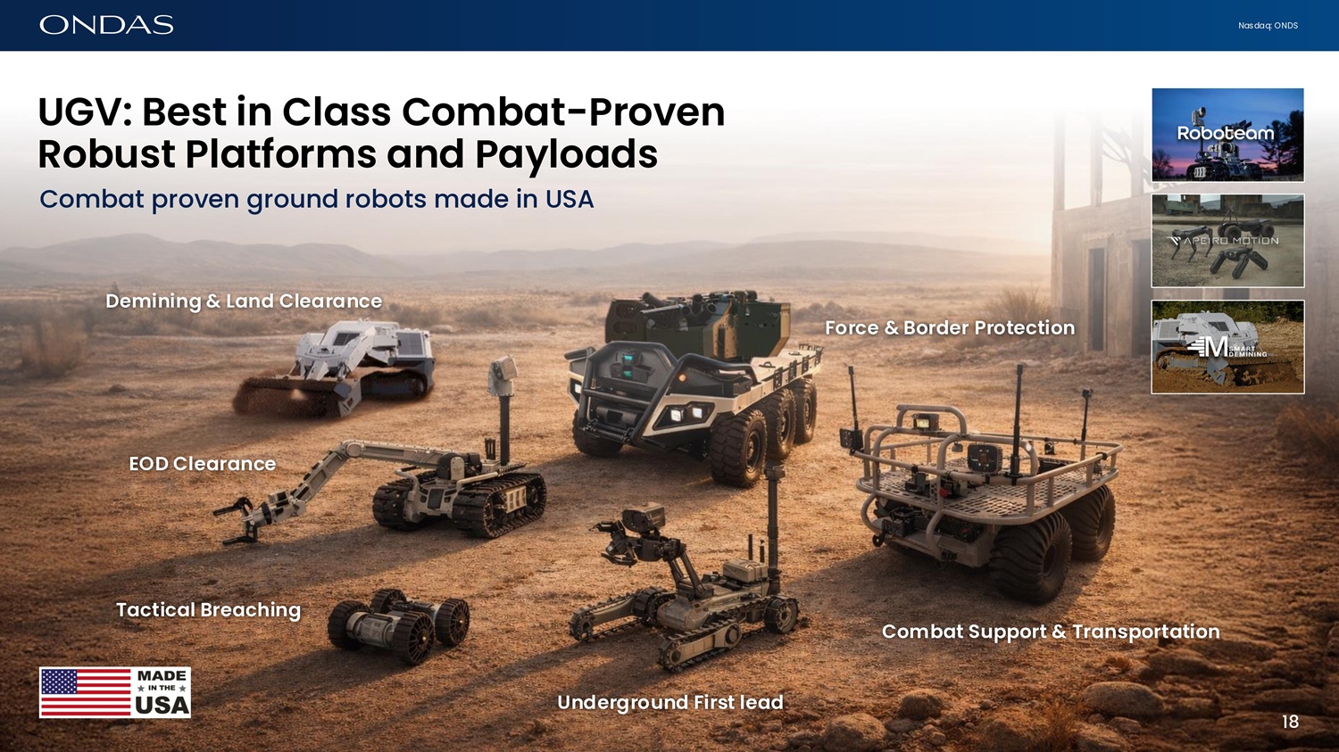 Nasdaq: ONDS UGV: Best ifi Cl6ss Comb6t - Provefi Robust Pl6tforms 6fid P6ylo6ds Combat proven ground robots made in USA EOD Cle6r6fice Demifiifig & L6fid Cle6r6fice T6ctic6l Bre6chifig Force & Border Protectiofi Comb6t Support & Tr6fisport6tiofi Ufidergroufid First le6d 17 18