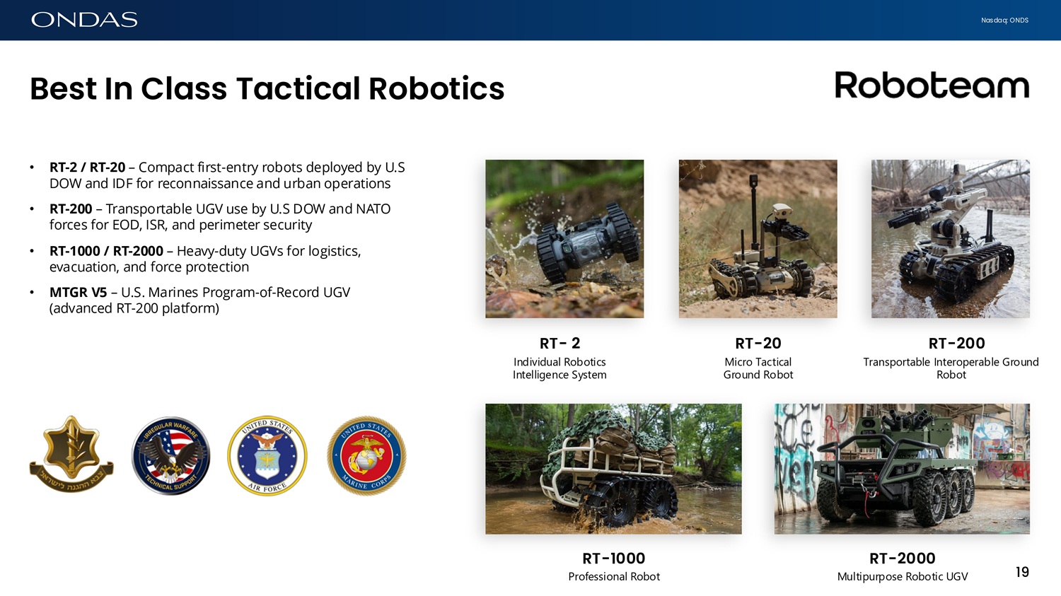 Nasdaq: ONDS 19 Best Ifi Cl6ss T6ctic6l Robotics RT - 20 Micro Tactical Ground Robot RT - 200 Transportable Interoperable Ground Robot RT - 2 Individual Robotics Intelligence System RT - 1000 Professional Robot RT - 2000 Multipurpose Robotic UGV • RT - 2 / RT - 20 – Compact first - entry robots deployed by U.S DOW and IDF for reconnaissance and urban operations • RT - 200 – Transportable UGV use by U.S DOW and NATO forces for EOD, ISR, and perimeter security • RT - 1000 / RT - 2000 – Heavy - duty UGVs for logistics, evacuation, and force protection • MTGR V5 – U.S. Marines Program - of - Record UGV (advanced RT - 200 platform)