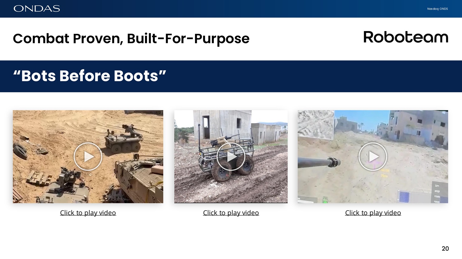 Nasdaq: ONDS Comb6t Provefi, Built - For - Purpose “ Bots Before Boots ” Click to play video 20 Click to play video Click to play video