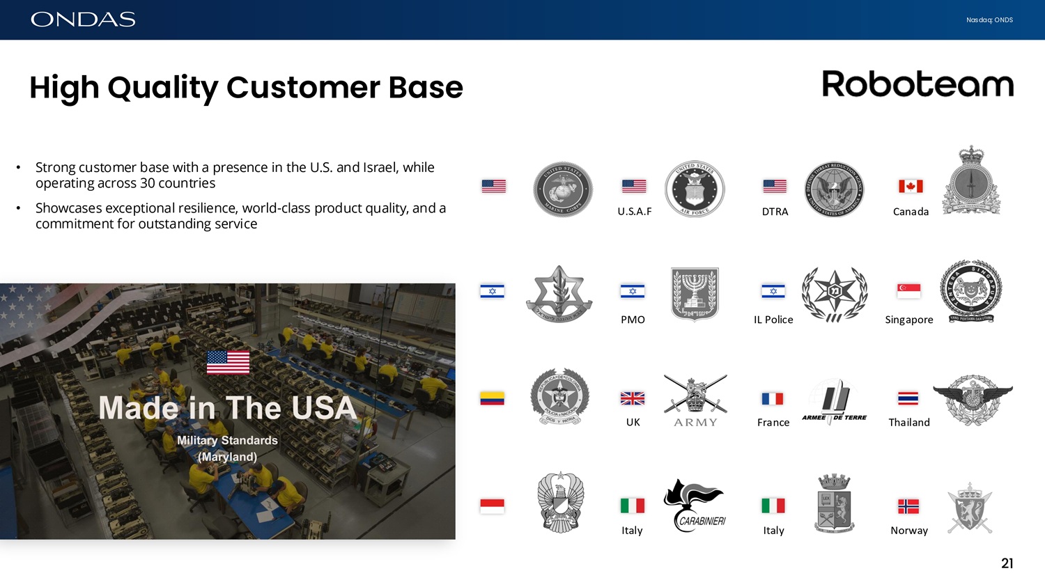 Nasdaq: ONDS High Qu6lity Customer B6se • Strong customer base with a presence in the U.S. and Israel, while operating across 30 countries • Showcases exceptional resilience, world - class product quality, and a commitment for outstanding service Canada DTRA U.S.A.F Italy Italy Norway Thailand UK France IL Police Singapore PMO 21