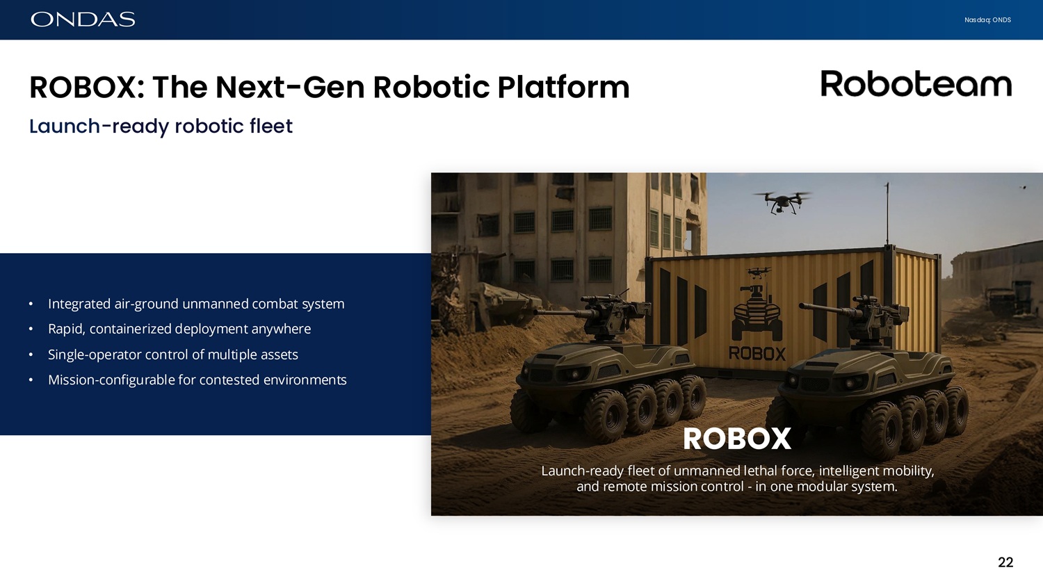 Nasdaq: ONDS ROBOX: The Next - Gefi Robotic Pl6tform Launch - ready robotic fleet • Integrated air - ground unmanned combat system • Rapid, containerized deployment anywhere • Single - operator control of multiple assets • Mission - configurable for contested environments ROBOX Launch - ready fleet of unmanned lethal force, intelligent mobility, and remote mission control - in one modular system. 22