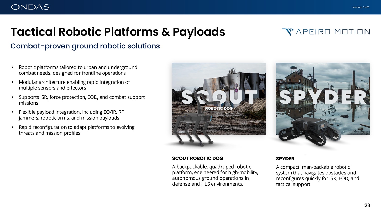 Nasdaq: ONDS T6ctic6l Robotic Pl6tforms & P6ylo6ds SCOUT ROBOTIC DOG A backpackable, quadruped robotic platform, engineered for high - mobility, autonomous ground operations in defense and HLS environments. SPYDER A compact, man - packable robotic system that navigates obstacles and reconfigures quickly for ISR, EOD, and tactical support. Combat - proven ground robotic solutions • Robotic platforms tailored to urban and underground combat needs, designed for frontline operations • Modular architecture enabling rapid integration of multiple sensors and effectors • Supports ISR, force protection, EOD, and combat support missions • Flexible payload integration, including EO/IR, RF, jammers, robotic arms, and mission payloads • Rapid reconfiguration to adapt platforms to evolving threats and mission profiles 23