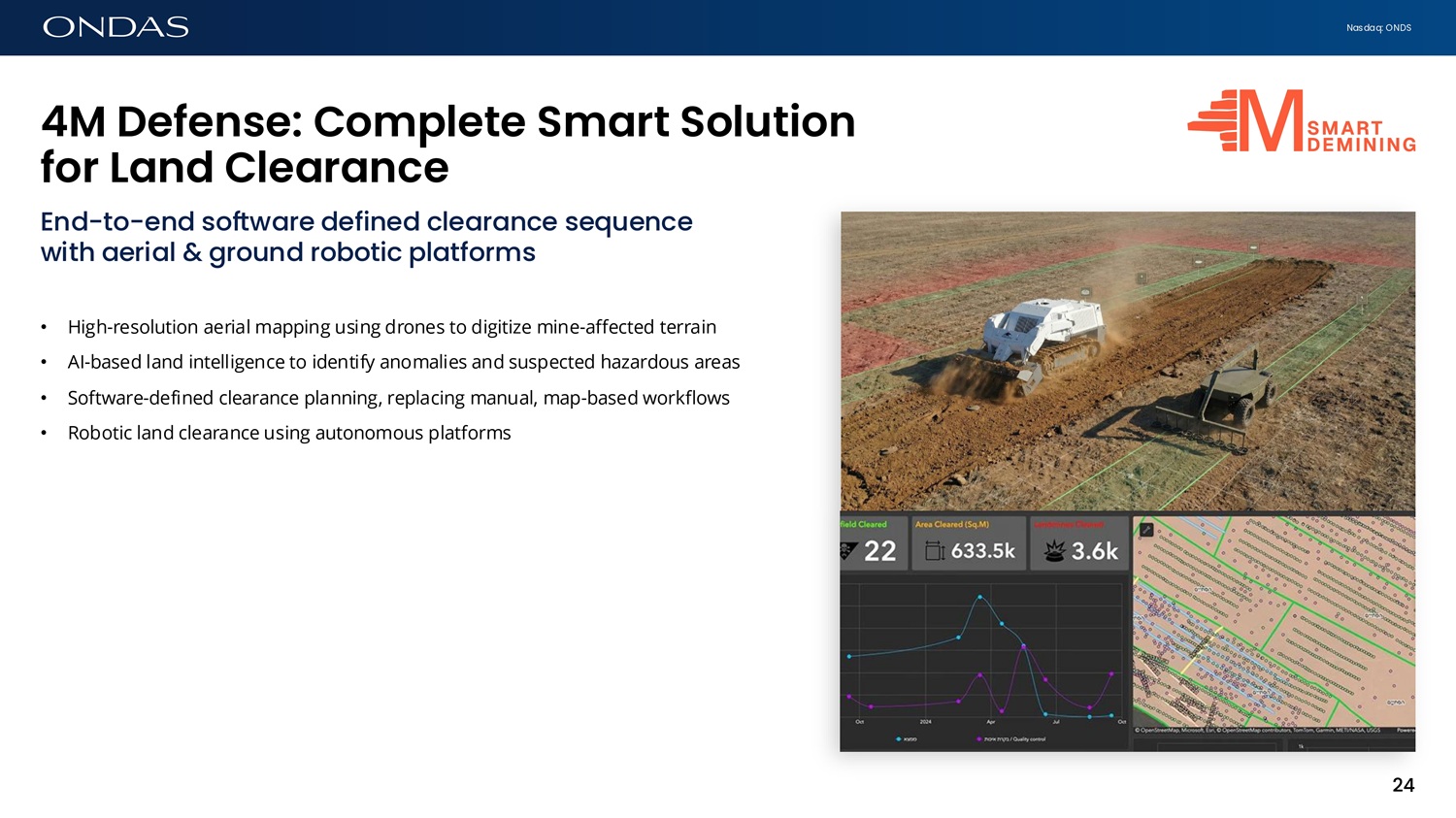 Nasdaq: ONDS 4M Defefise: Complete Sm6rt Solutiofi for L6fid Cle6r6fice End - to - end software defined clearance sequence with aerial & ground robotic platforms • High - resolution aerial mapping using drones to digitize mine - affected terrain • AI - based land intelligence to identify anomalies and suspected hazardous areas • Software - defined clearance planning, replacing manual, map - based workflows • Robotic land clearance using autonomous platforms 24