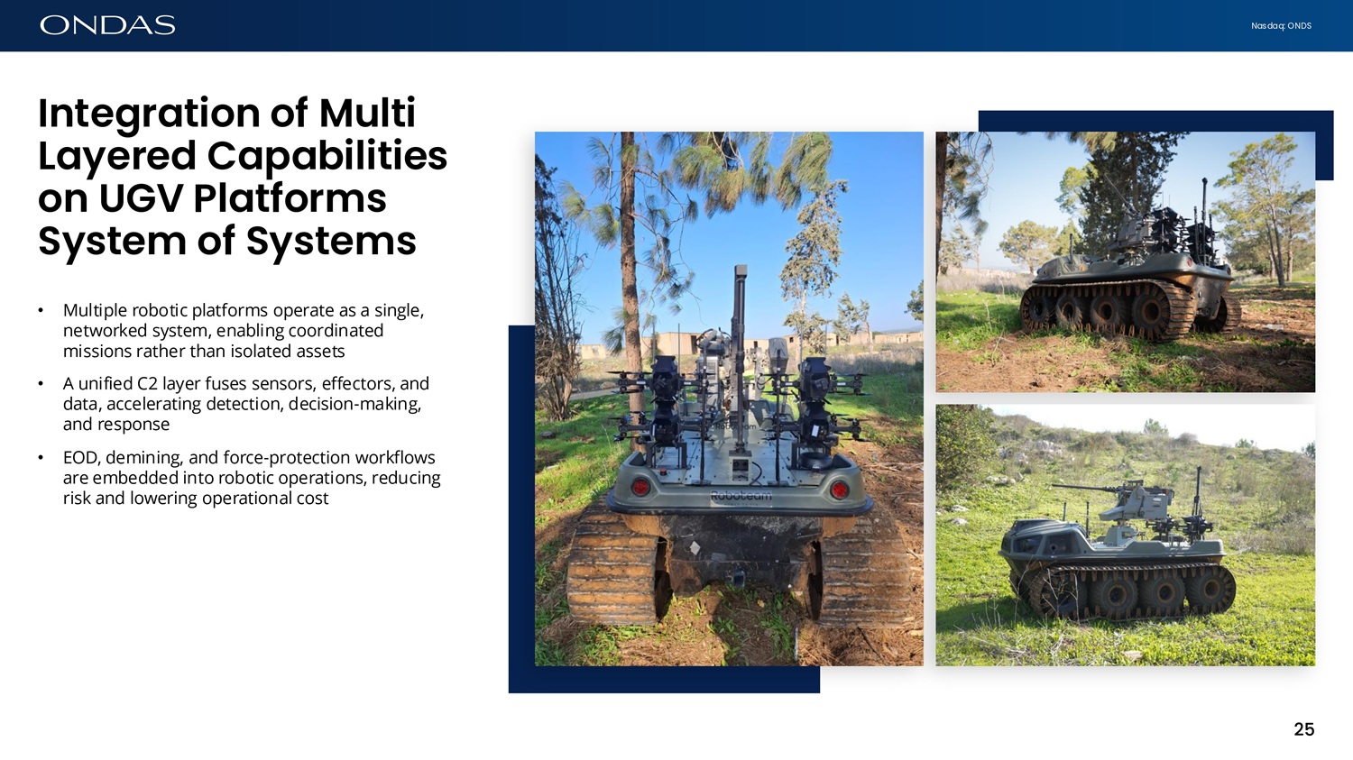 Nasdaq: ONDS Ifitegr6tiofi of Multi L6yered C6p6bilities ofi UGV Pl6tforms System of Systems • Multiple robotic platforms operate as a single, networked system, enabling coordinated missions rather than isolated assets • A unified C2 layer fuses sensors, effectors, and data, accelerating detection, decision - making, and response • EOD, demining, and force - protection workflows are embedded into robotic operations, reducing risk and lowering operational cost 25