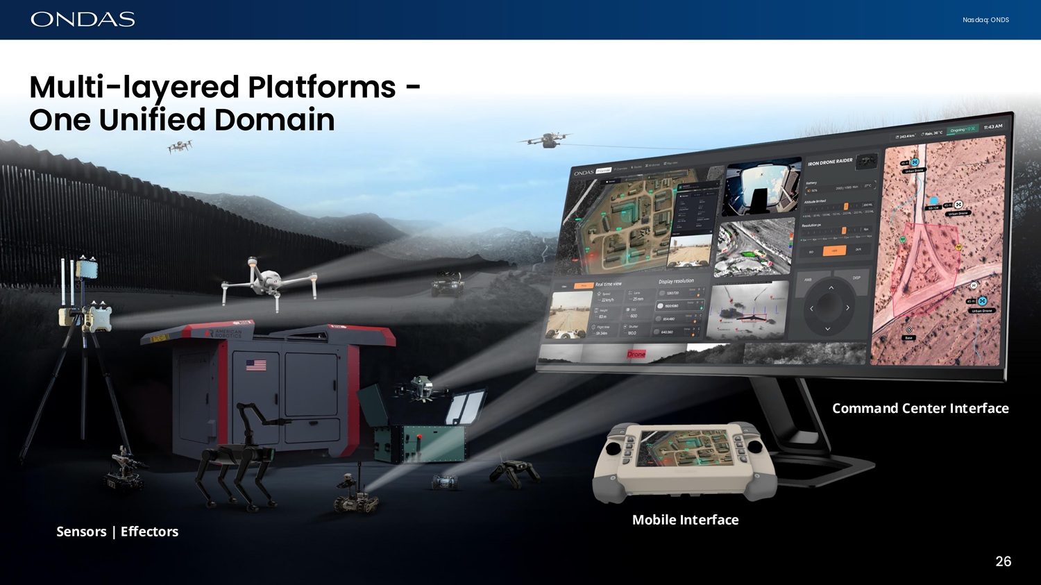 Nasdaq: ONDS Multi - l6yered Pl6tforms - Ofie Ufiified Dom6ifi Command Center Interface Mobile Interface Sensors | Effectors 26 26