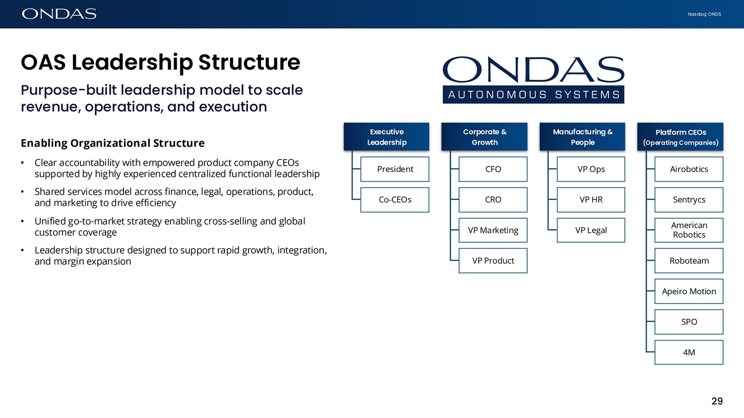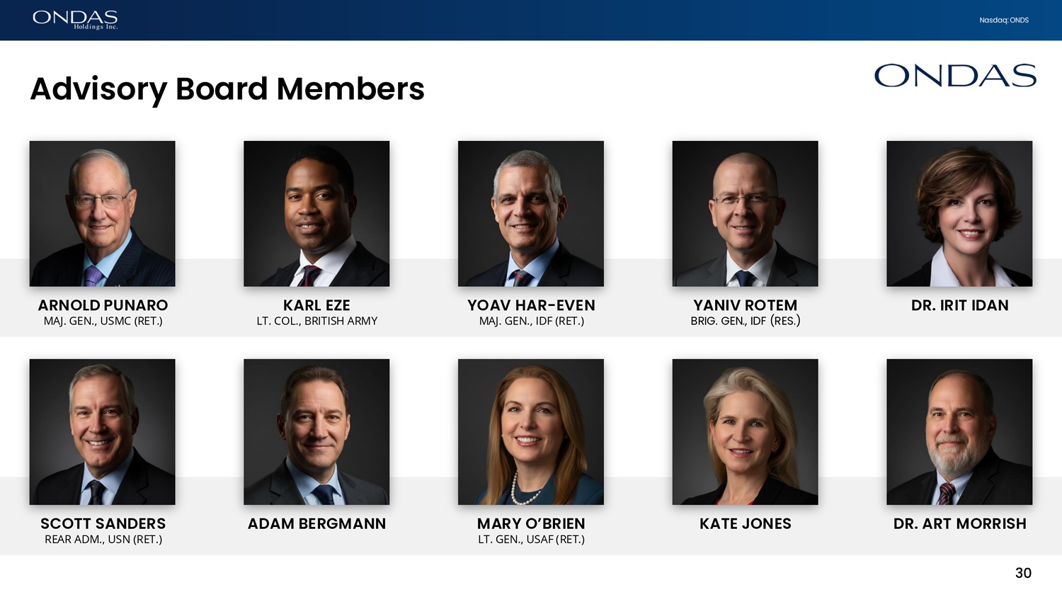 Nasdaq: ONDS Purpose - built leadership model to scale revenue, operations, and execution Enabling Organizational Structure • Clear accountability with empowered product company CEOs supported by highly experienced centralized functional leadership • Shared services model across finance, legal, operations, product, and marketing to drive efficiency • Unified go - to - market strategy enabling cross - selling and global customer coverage • Leadership structure designed to support rapid growth, integration, and margin expansion Executive Le6dership President Co - CEOs Corpor6te & Growth CFO CRO VP Marketing VP Product M6fiuf6cturifig & People VP Ops VP HR VP Legal Pl6tform CEOs (Oper6tifig Comp6fiies) Airobotics Sentrycs American Robotics Roboteam Apeiro Motion SPO 4M OAS Le6dership Structure 29